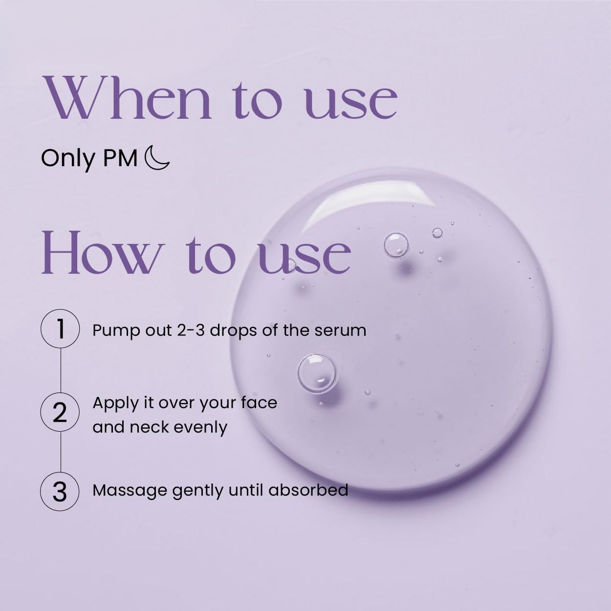 • Pump and apply 2-3 drops of serum by gently tapping it on the entire face and neck after cleansing and toning.