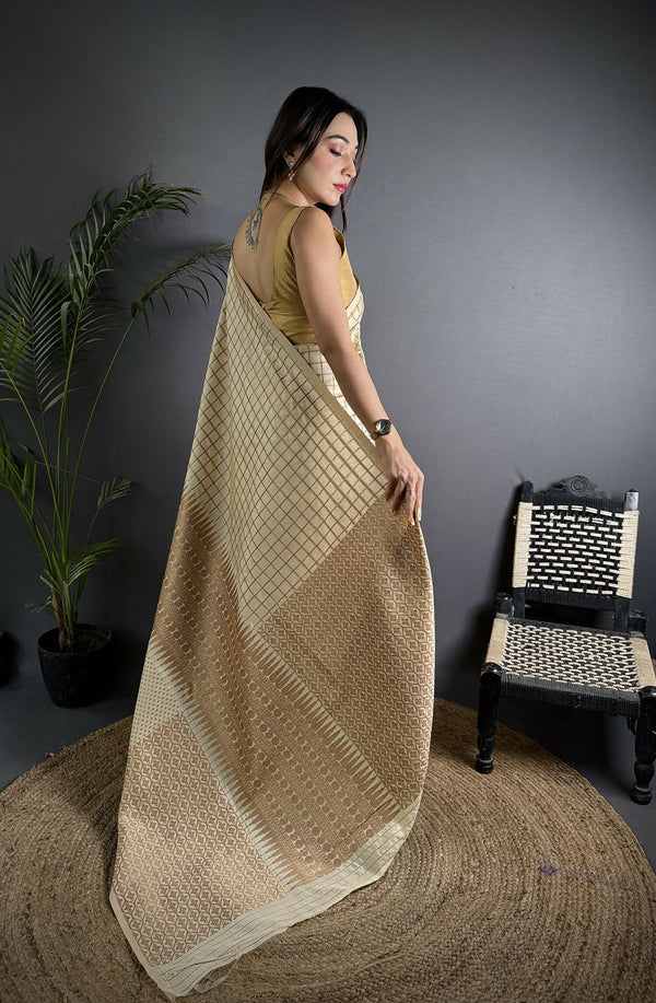 Joban Fashion Off White Banarasi Soft Lichi Silk Checks & Woven Saree