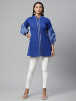 Blue-Coloured Pure Cotton Printed Tunic, has a Mandarine Collar, Full Sleeves, Hip length, 1 side Pocket, Crafted by liquid gold gota scallope lace. Taking the bright colours of summer and nature, Ahalyaa inspires the Women of style and substance to experiment with a range of colours from sophisticated black to subtle pastels and vibrant shades. So match the shade to your personality! Mix and match from a variety of colours and prints for a feminine look, or a modern twist.