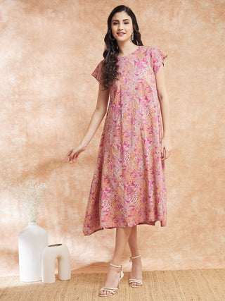 InWeave Women's Pink Coral Floral Print A Line Dress