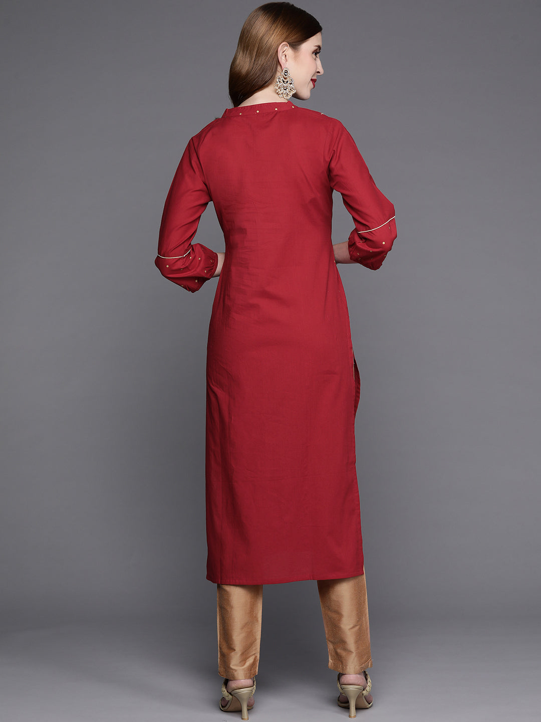 Varanga Women Maroon Straight Kurta With Gold Print And Embroidered Yoke