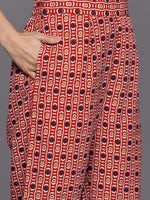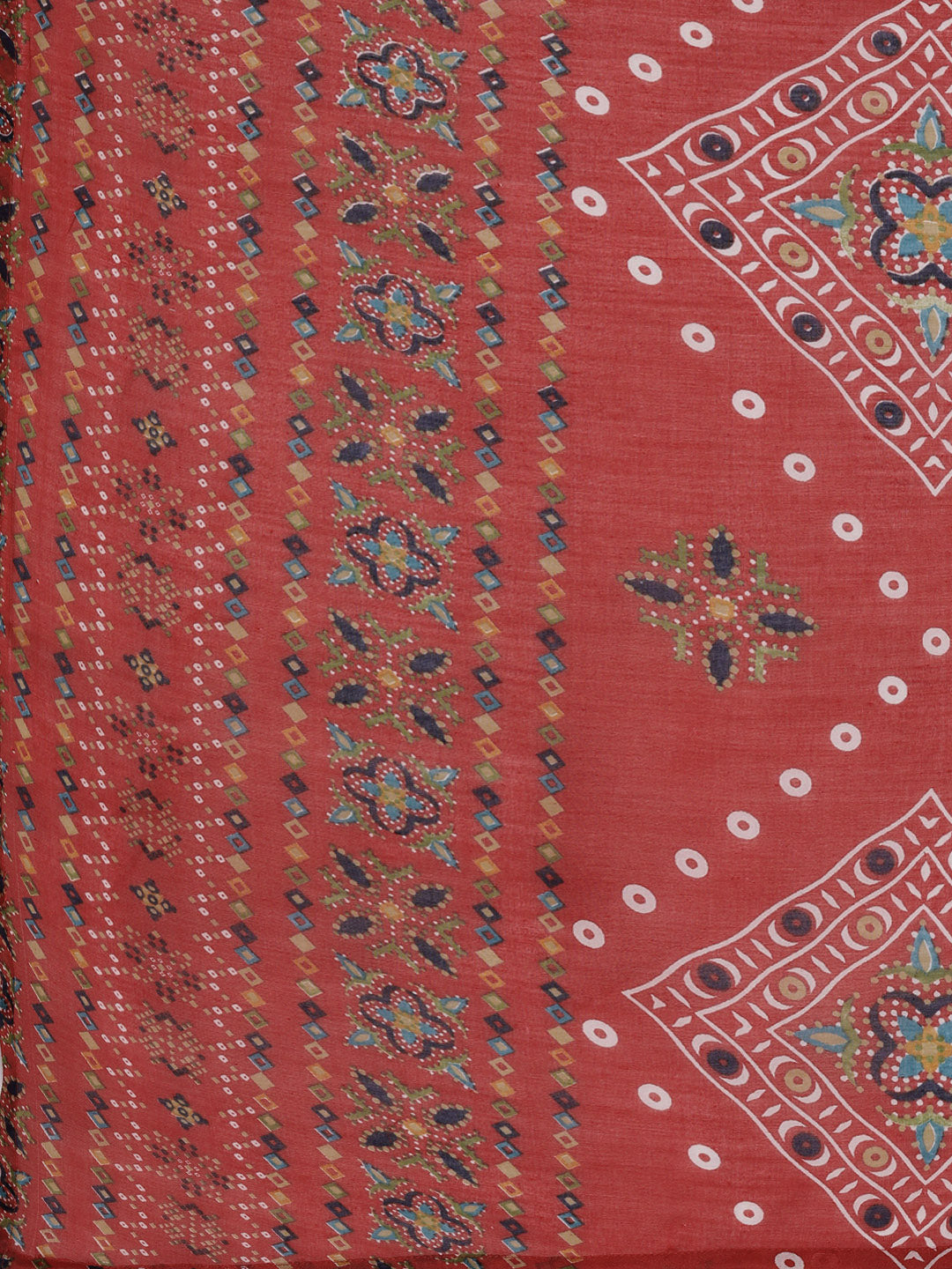 Red Bandhani Print Zari And Mirror Embroidered V- Neck, Three Quarter Sleeves Straight Kurta With Side Slit Paired With Printed Tonal Bottom And Dupatta