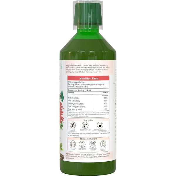 • Experience the revitalizing effects of Farm Naturelle - Magical Man Juice (750ml), formulated to support men's health and boost stamina. This potent blend is designed to provide essential nutrients and natural compounds that enhance vitality, energy, and overall well-being. The juice is crafted with a mix of carefully selected herbs and ingredients known for their benefits in improving male health. This 15-day pack ensures you have a consistent supply to kickstart your health regimen. The blend includes powerful herbs that may help improve stamina, support reproductive health, and increase energy levels. Ingredients like Ashwagandha, Gokshura, and Shilajit are traditionally known to enhance physical performance, reduce fatigue, and promote a sense of overall wellness. This juice aims to provide a natural way to improve health and maintain energy levels throughout the day.