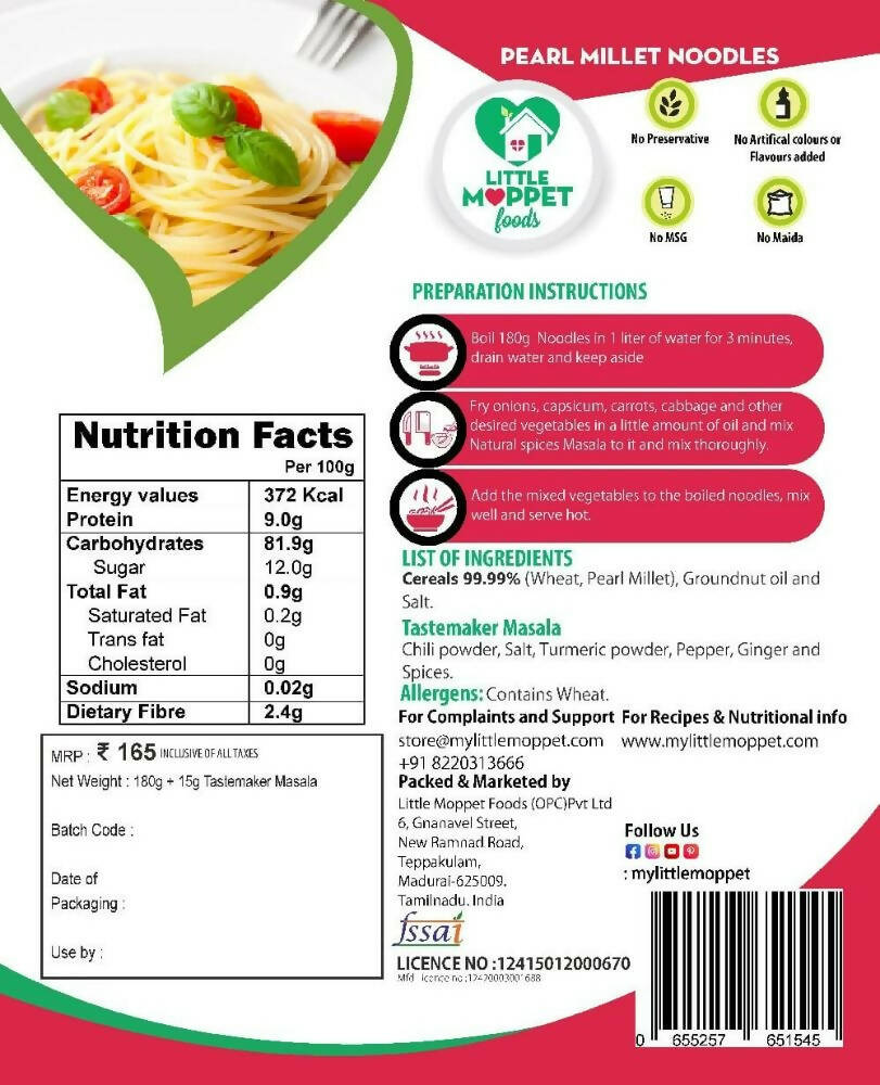 Little Moppet Foods Pearl Millet NoodlesEach pack contains 180 grams + 15 grams taste maker masalaAbout the Product: Noodles made of Pearl Millet, ...