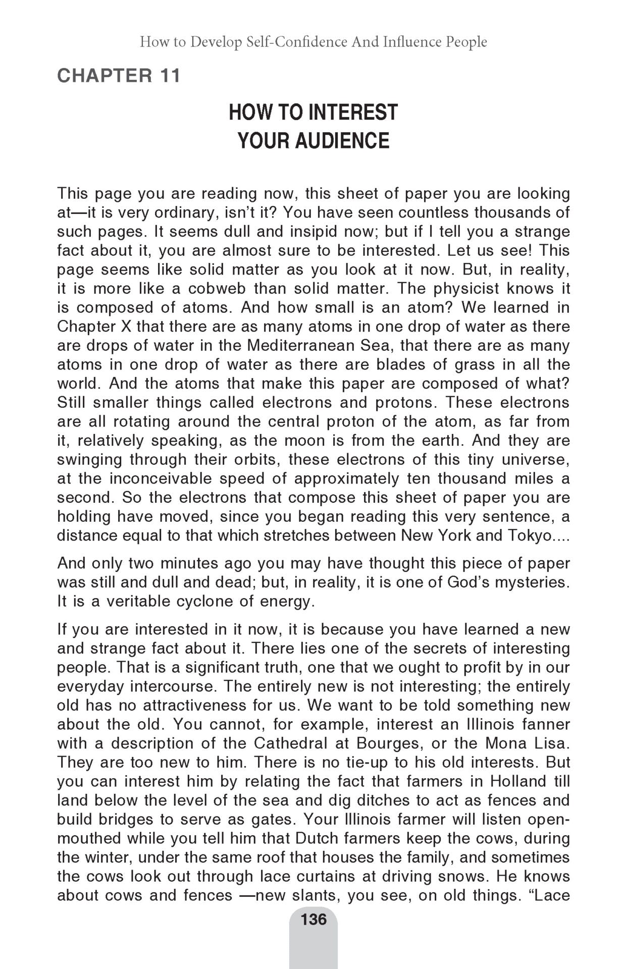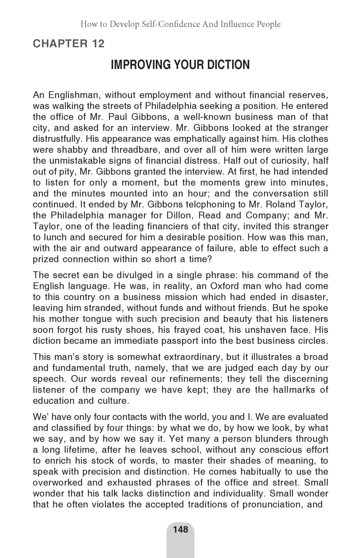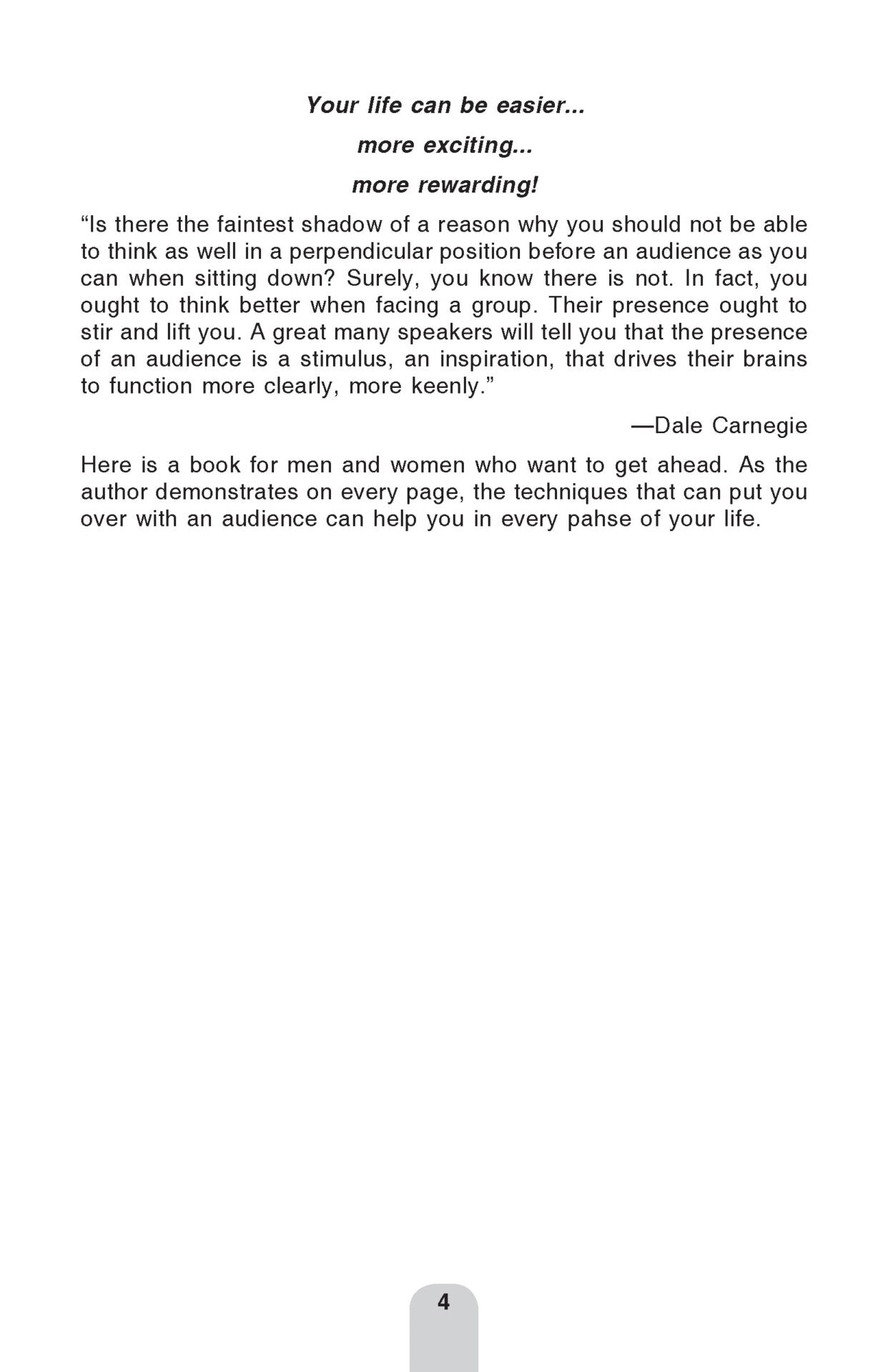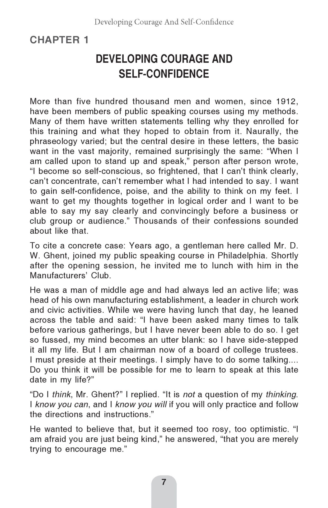 • If you are afraid of public speaking and worry about speaking up in front of everyone, then this book is right for you! It holds the key to fight away your fears.“Is there the faintest shadow of a reason why you should not be able to think as well in a perpendicular position before an audience as you can when sitting down? Surely you know there is not.”Here is a difference way to develop self-confidence and become a good public speaker to the secrets of memory power and good delivery, natural laws of remembering and the essential elements in successful speaking, this book discusses the ways of opening and closing a talk and keeping the audience interested. It Contains many of the words of wisdom that have helped our students to achieve their goals. In re-reading the book, I realize how many wise rules it contains for overcoming fear and gaining self-confidence. Practical techniques and suggestions are added to those rules that will help everyone to meet people as individuals or as groups, and talk with them effectively.