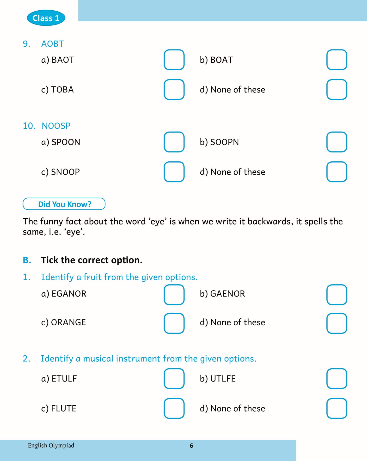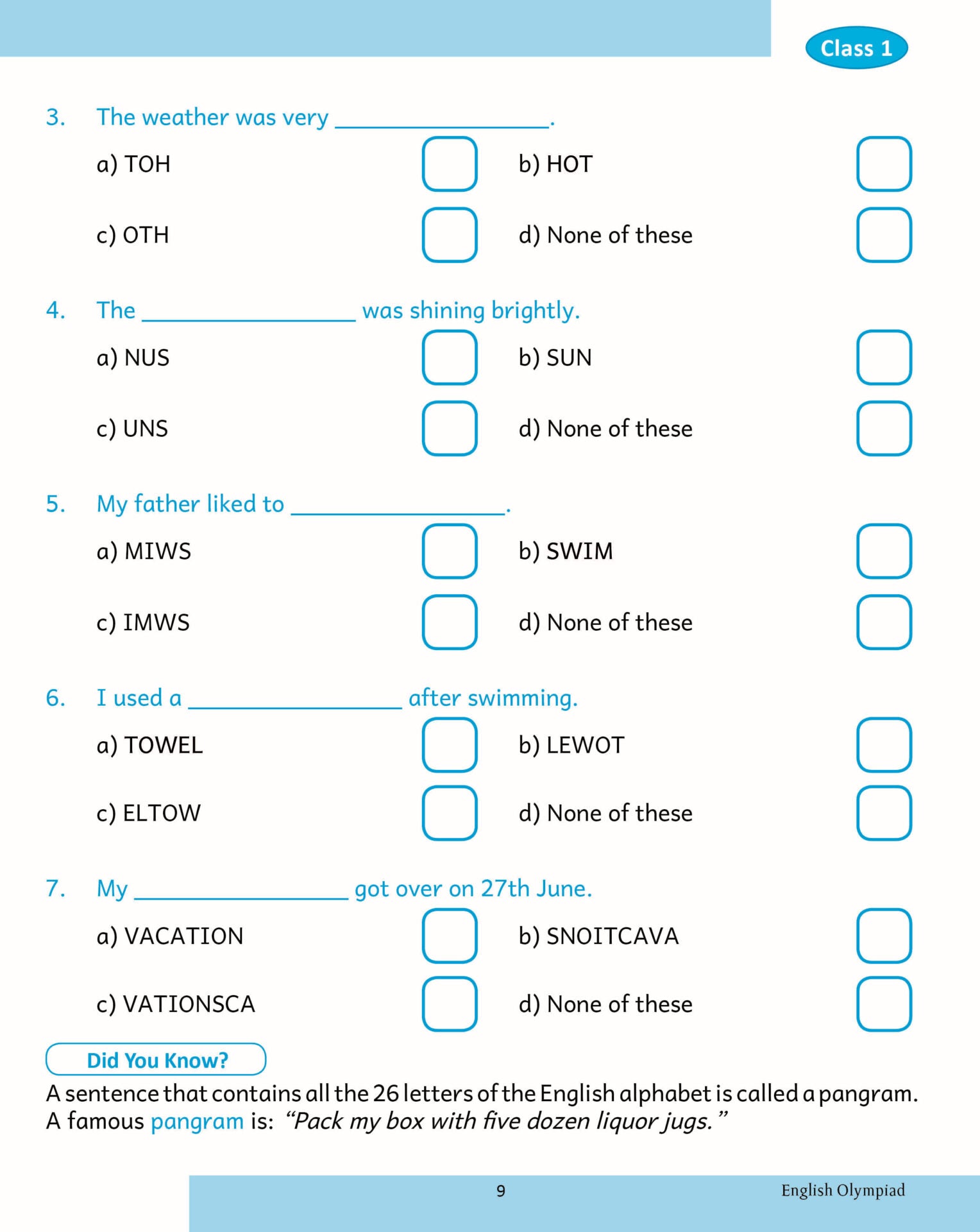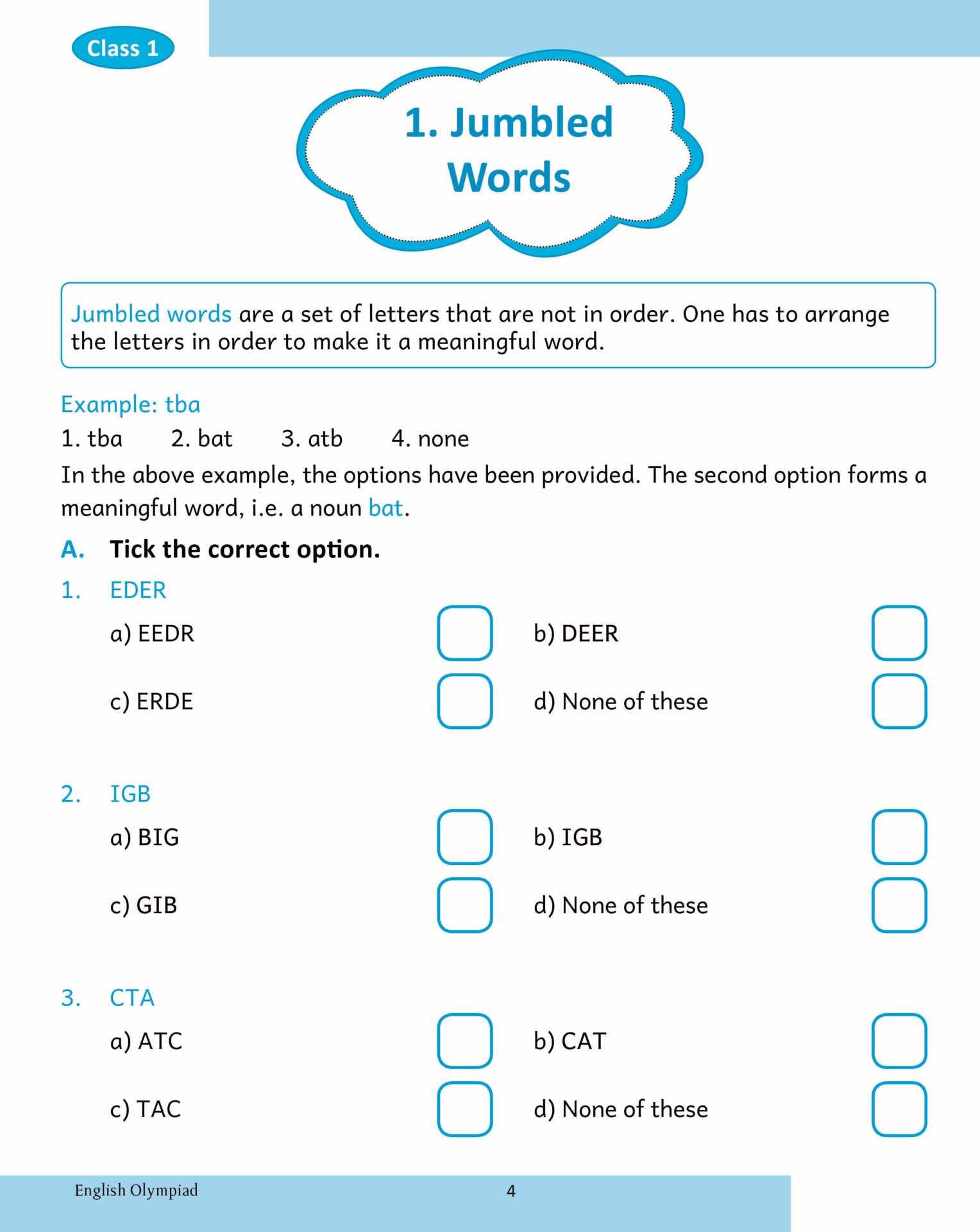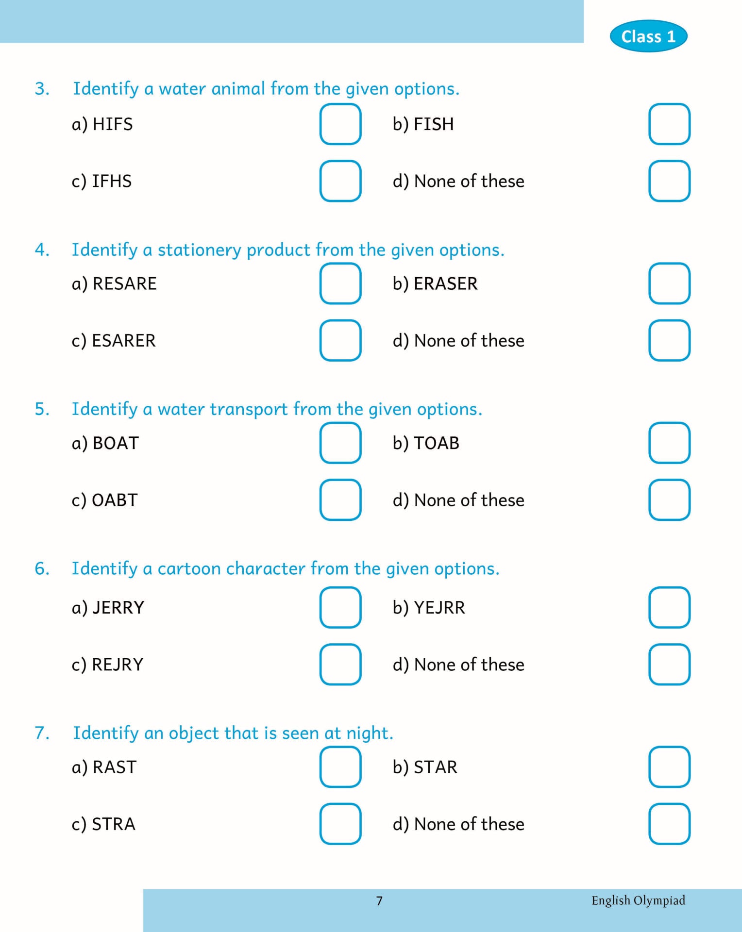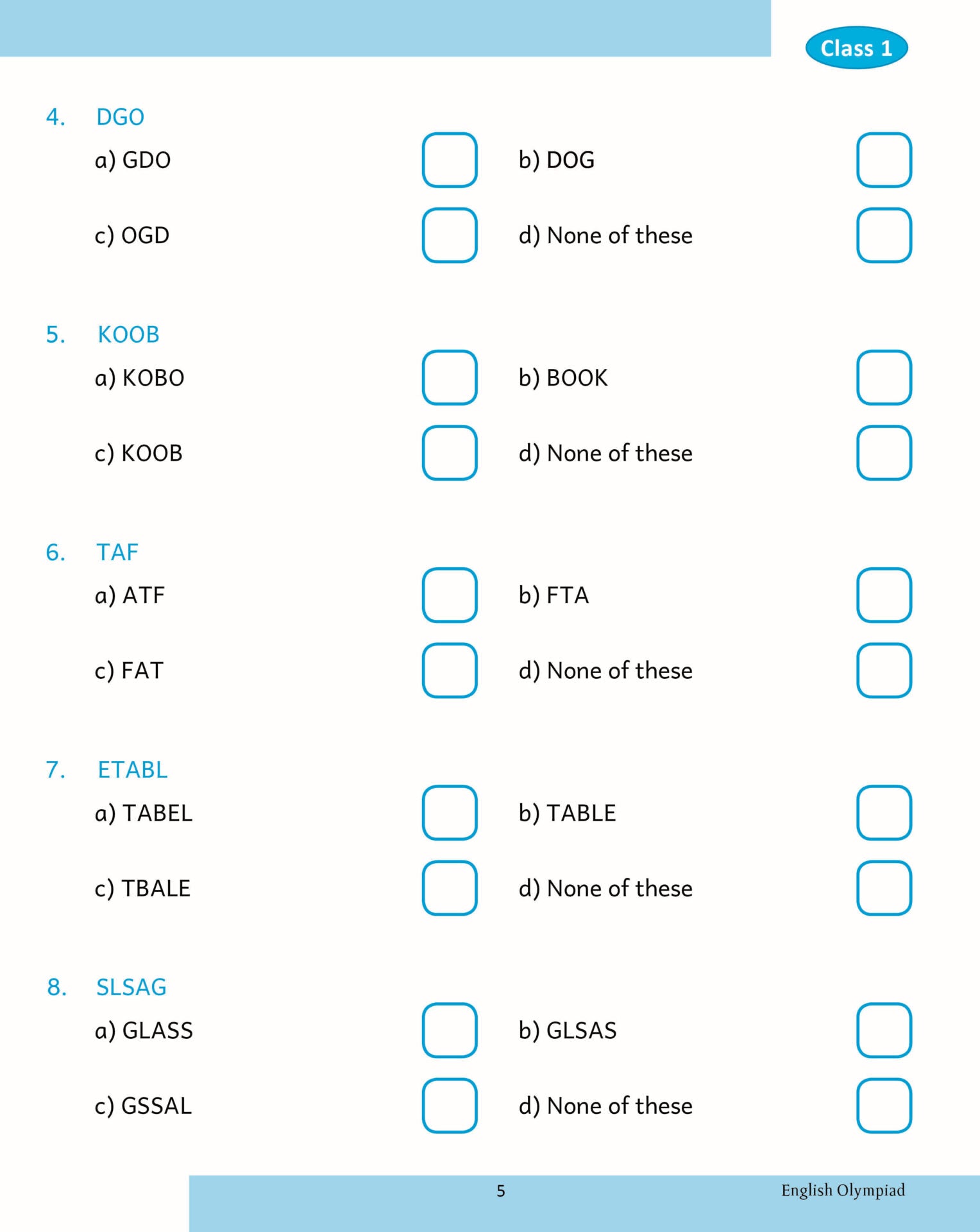 • Olympiad English Series caters to improving the child's listening, speaking, reading and writing skills. Olympiad English series aims at motivating the students to strive for better performance in English. All questions are in MCQ format that tests student's observation, analytical, problem solving and higher-order thinking skills.