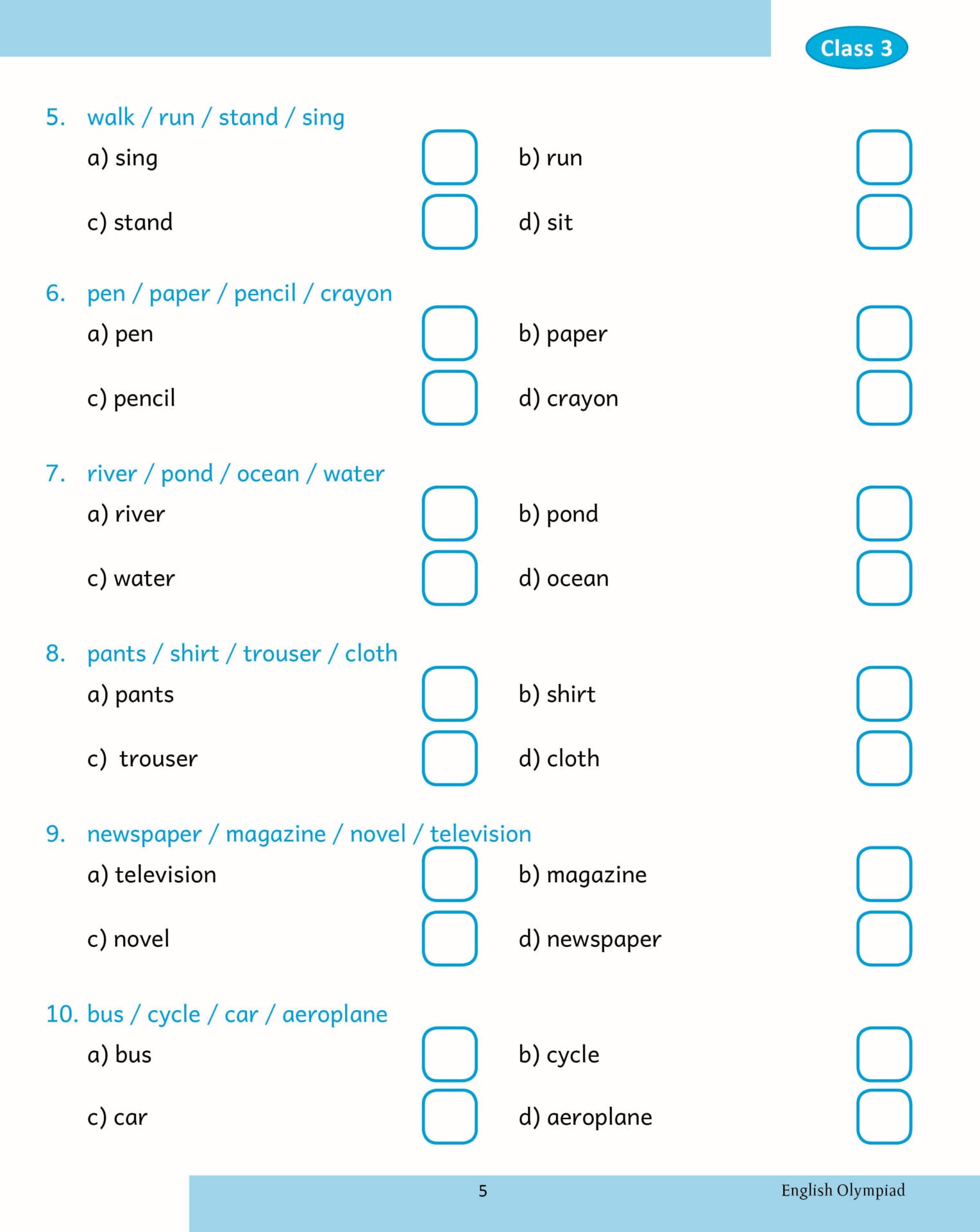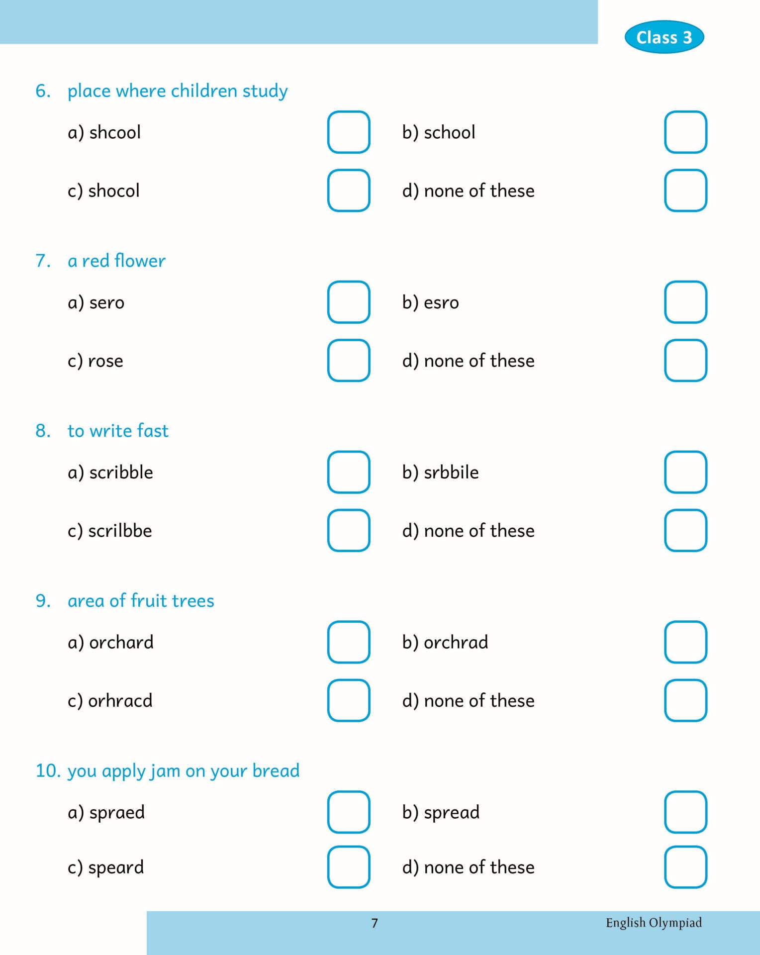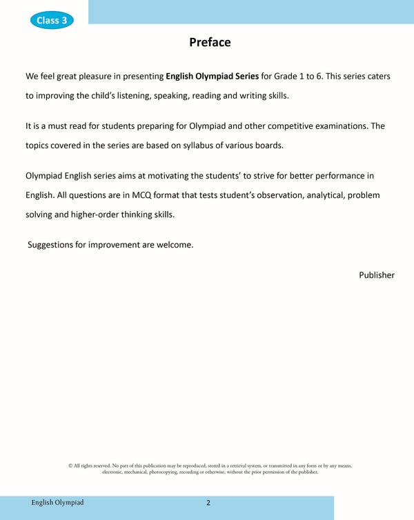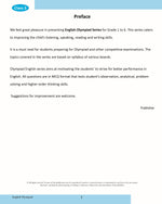 • Olympiad English Series caters to improving the child's listening, speaking, reading and writing skills. Olympiad English series aims at motivating the students to strive for better performance in English. All questions are in MCQ format that tests student's observation, analytical, problem solving and higher-order thinking skills.