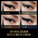 • For ultra-precision and bold eyes in just one stroke, there's Max Factor Masterpiece Matte Liquid Eyeliner. It's a highly pigmented waterproof liquid eyeliner that provides intense colour and up to 12 hours of wear with a matte finish. From beginners to pros, this liquid eyeliner pen draws a fine line and glides on effortlessly thanks to the high-precision tip applicator. The quick-drying formula ensures a mess-free application. Sweat-proof, humidity-proof, smudge-proof, flake-proof, fade-proof and transfer-proof, the vegan formula is made from a well-balanced combination of polymeric film formers and light diffusing particles to offer a deep matte finish with great staying power. Available in 4 shades for the perfect eyeliner look.