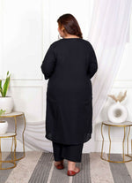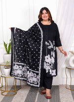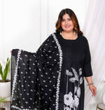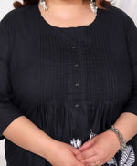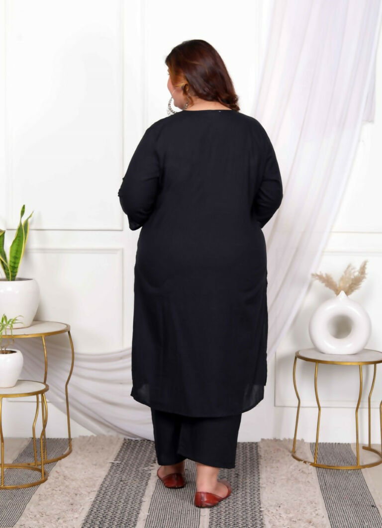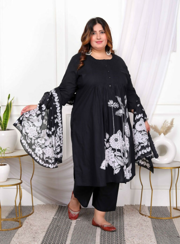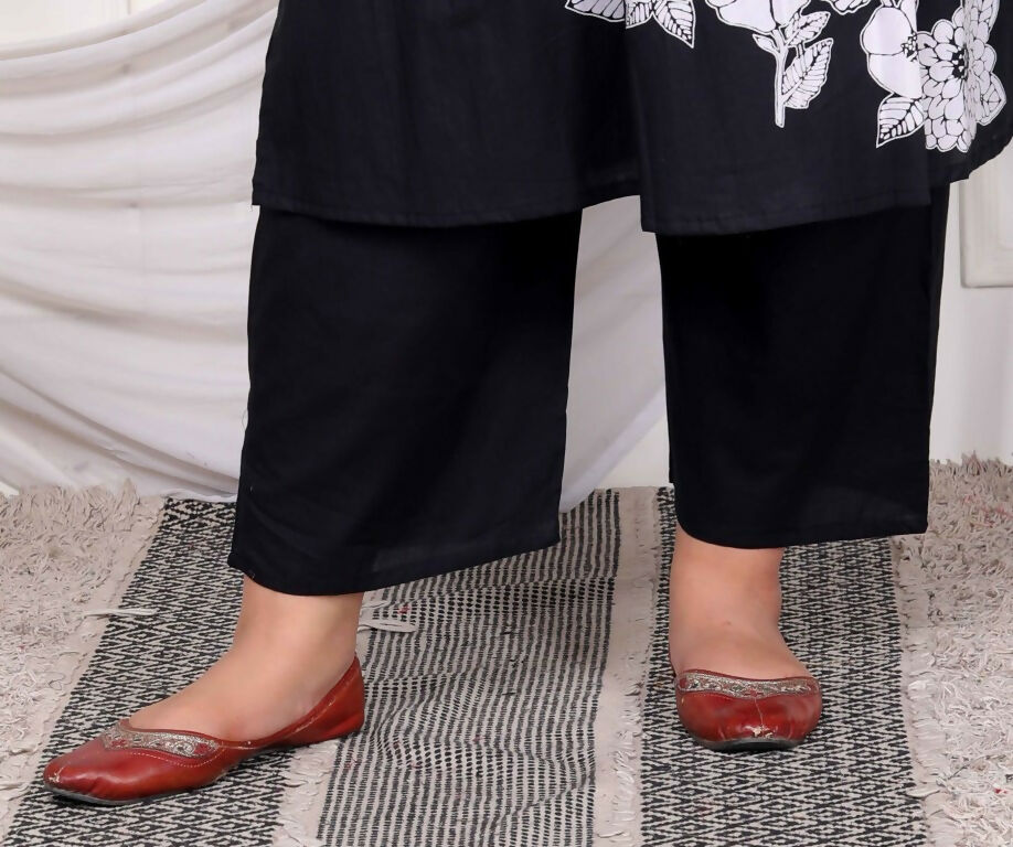 Add Ethnic Chic Toy Your Wardrobe With This Black Suit Set From Miravan. Made From High Quality Pure Cotton, It Features Button Fly Closure,Pintuck Detailing And Floral Pattern Along With Three Fourth Sleeves & Round Neck Design. Pair It With Sandals Or Wedges With Minimal Jewellery To Complete Your Ensemble.