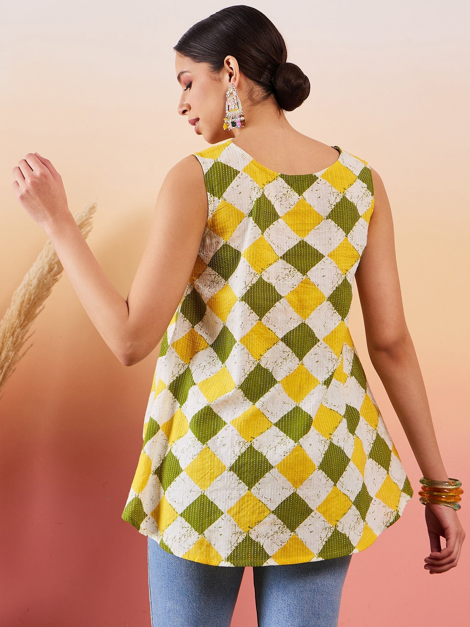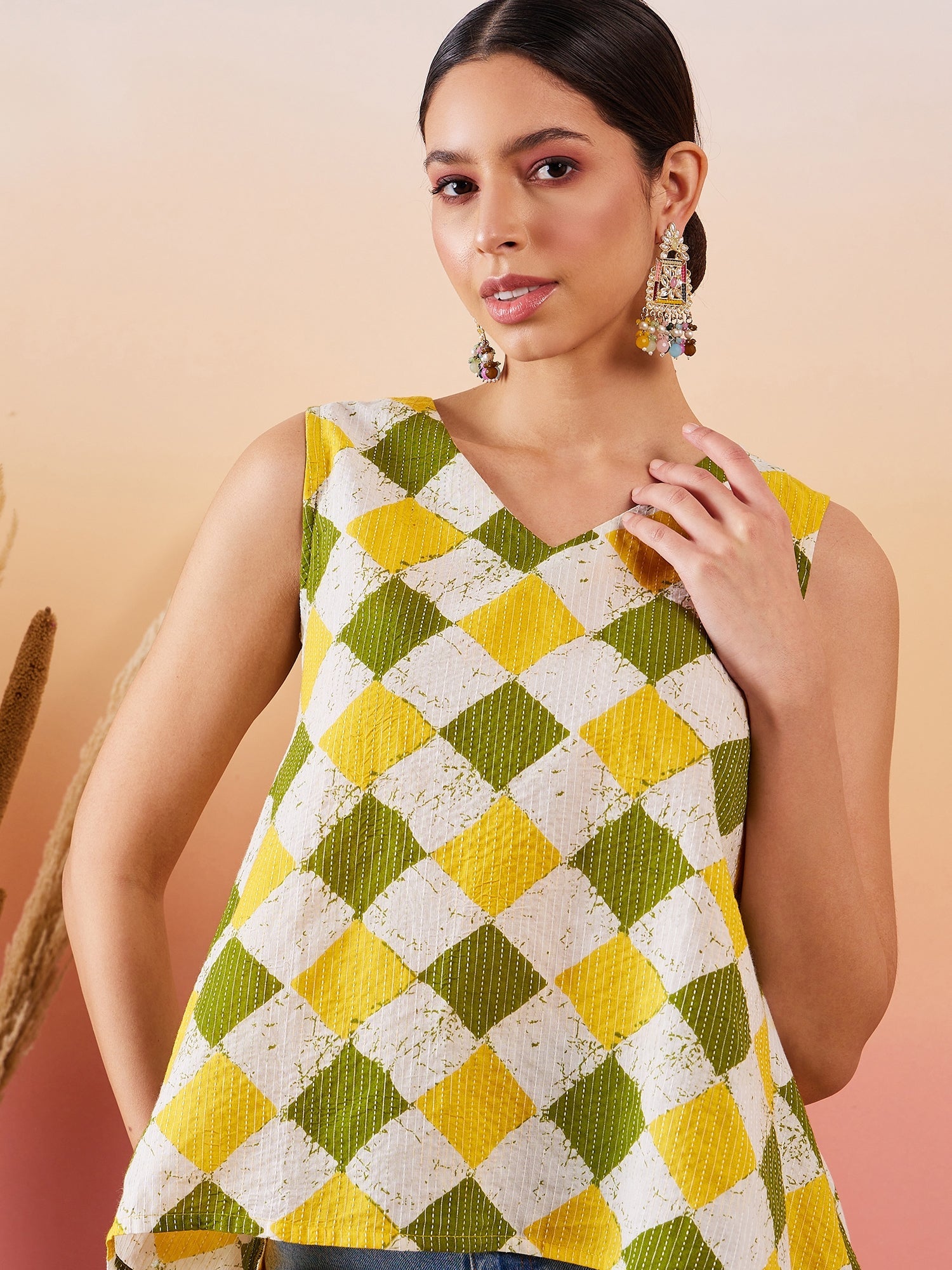 InWeave Yellow Green Geometric Print Kantha V Neck W/S Top - Distacart