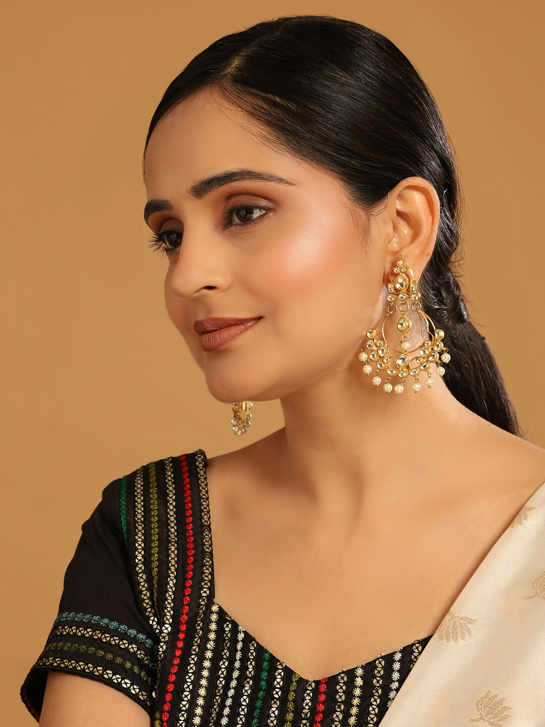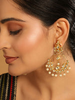 22 k Gold-toned contemporary shaped chandbalis, gold-plated, has kundan and pearl studded details. Secured with a post and back closure.