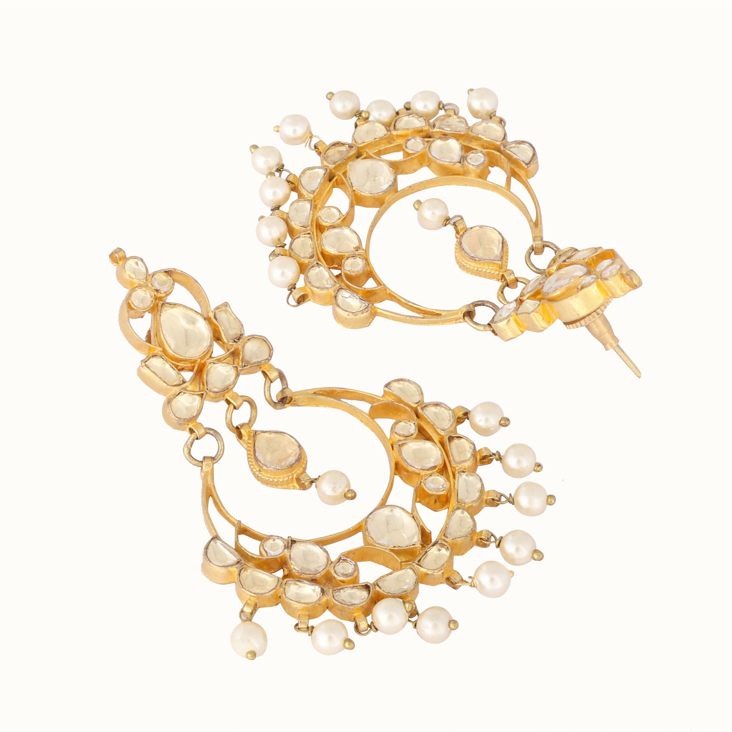 Nuyug 22K Gold Plated Kundan Studded Contemporary Shaped Pearl Drop ChandbalisAbout the product:22 k Gold-toned contemporary shaped chandbalis, gol...