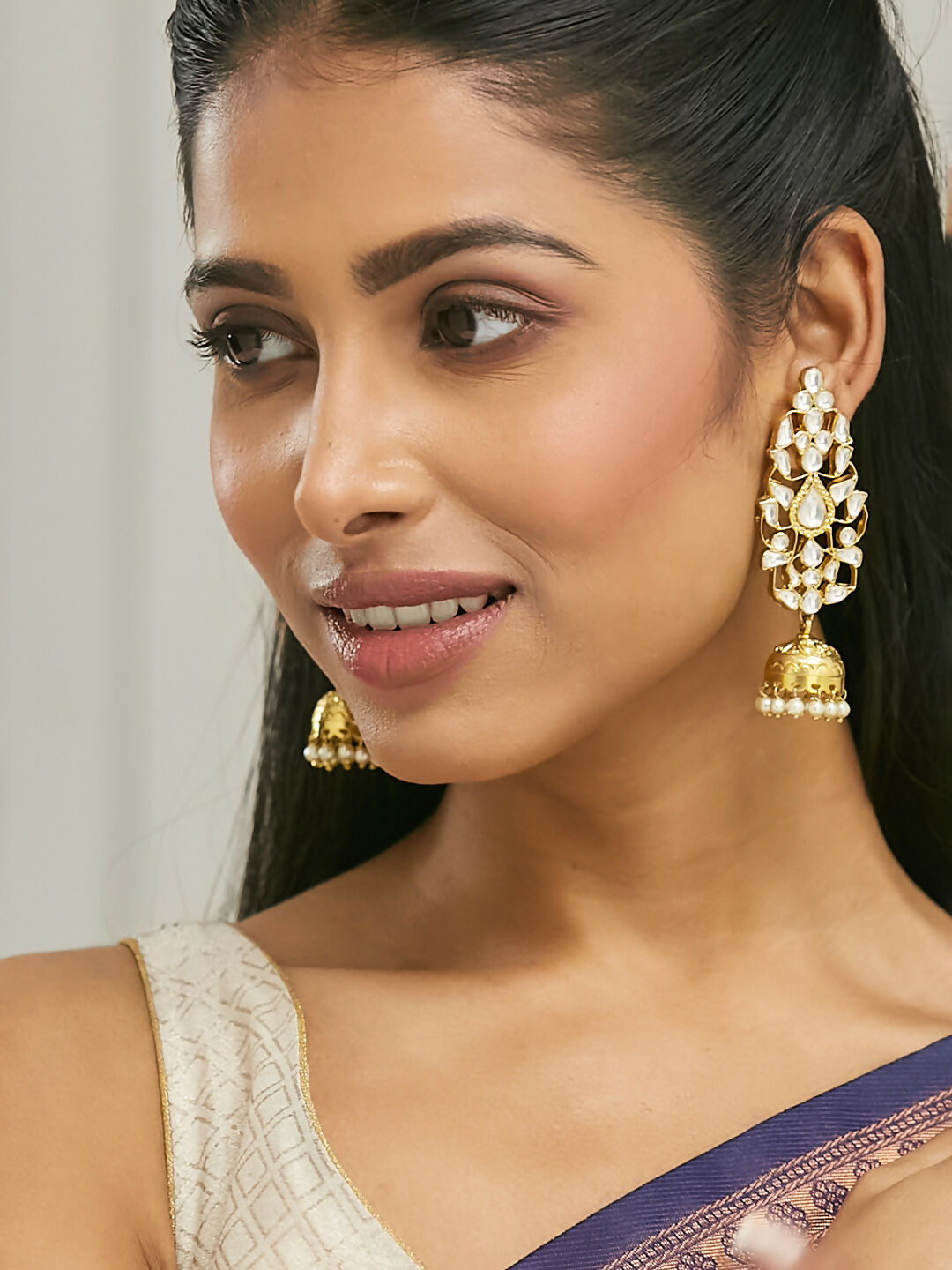 Nuyug 22K Gold-Plated Regal Kundan Stone Studded & Pearl Drop JhumkasAbout the product:22 k Gold-toned feather motif inspired jhumkas, gold-pla...