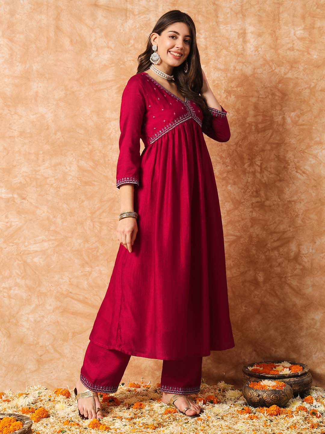 Kalini Ethnic Motif Embroidered Empire Thread Work Anarkali Kurta & Trousers With Dupatta Product Details Red embroidered Kurta with Trouser...