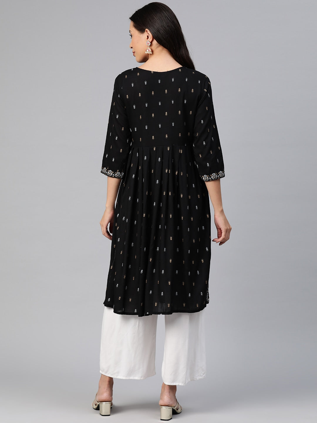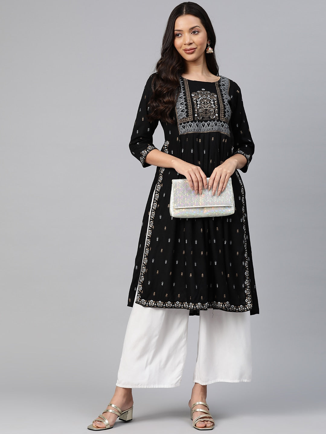 Kalini Ethnic Motifs Printed Mirror Work Kurta Product Details Colour: black and white Ethnic motifs printed Round neck Three-quarter, regular ...