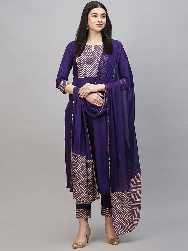 Kalini Geometric Yoke Design Gotta Patti Kurta & Trousers With Dupatta Product Details Purple, gold toned yoke design kurta with trousers wi...