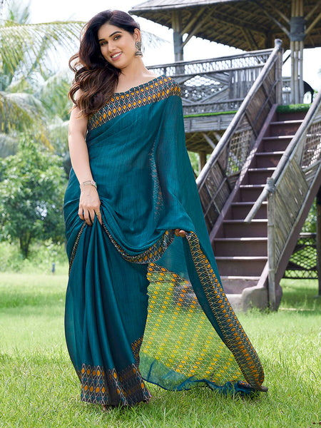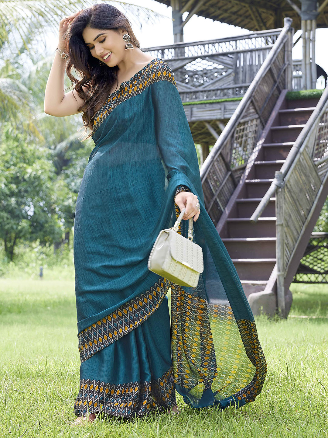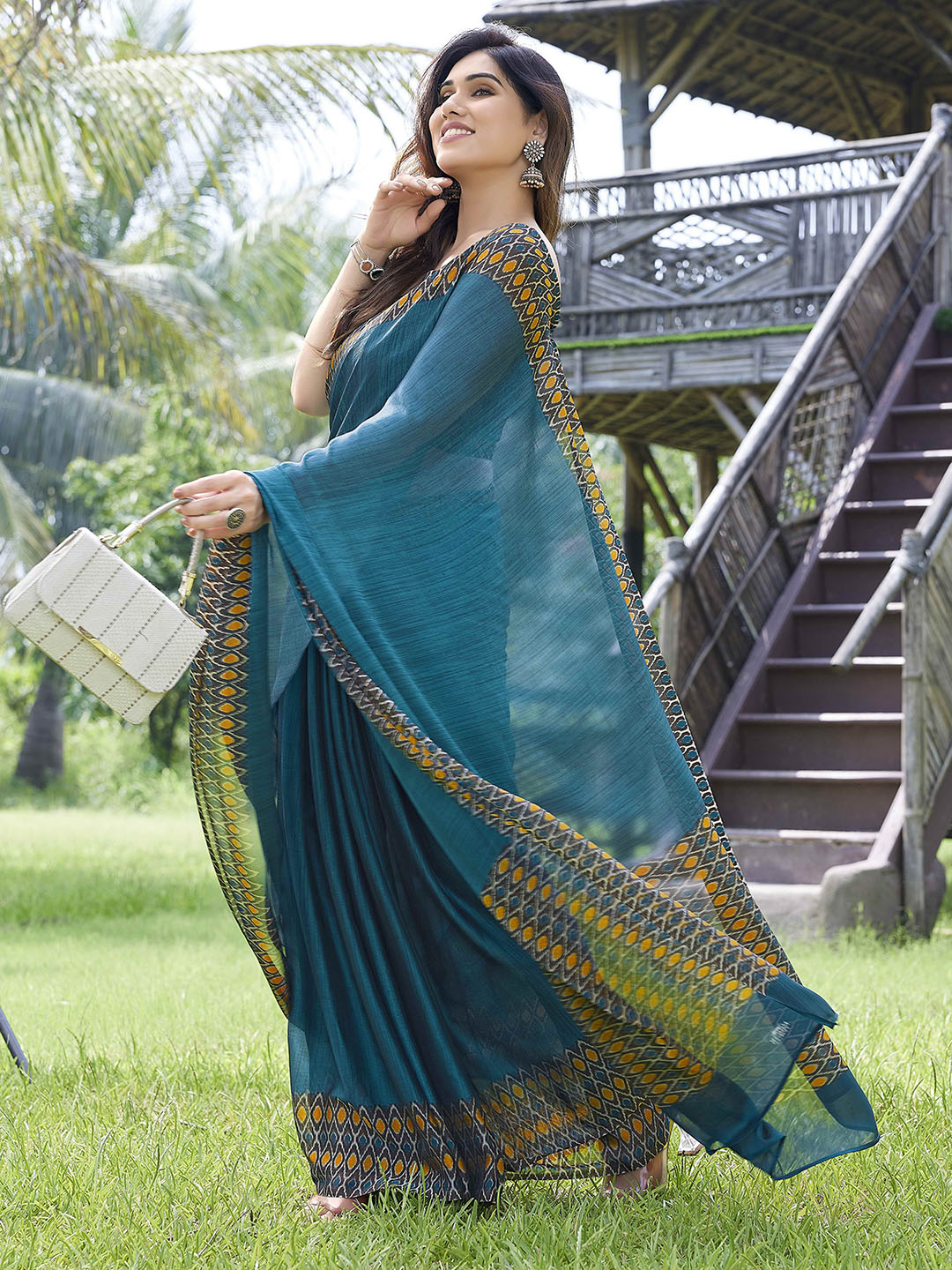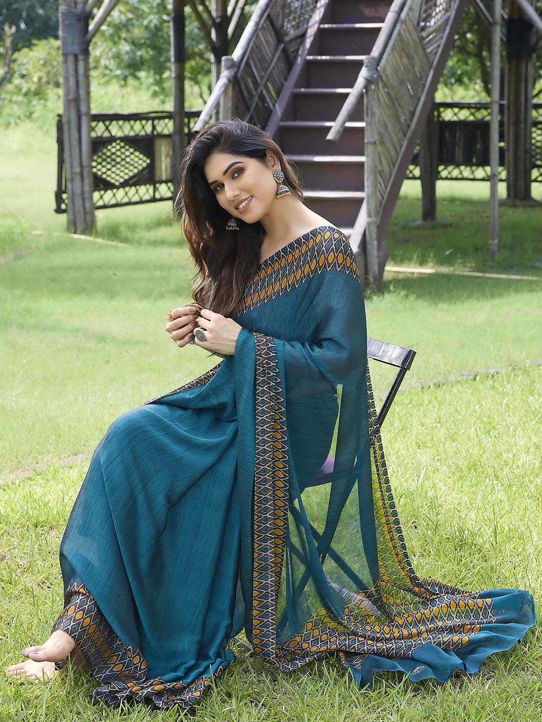 Kalini Turquoise Blue & Brown Solid Printed Border Chiffon Saree - Distacart