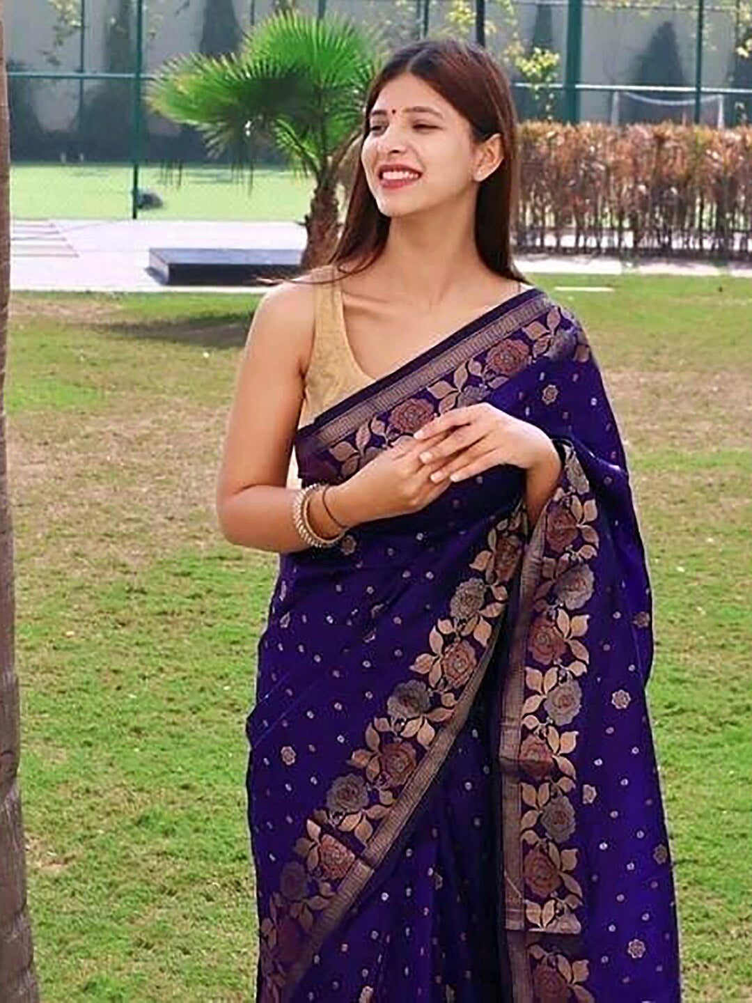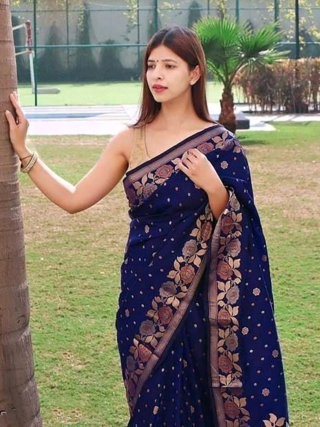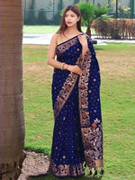 Kalini Woven Design Zari Silk Blend Banarasi Saree Product Details Design Details Navy blue and gold-toned banarasi saree Woven design saree ...