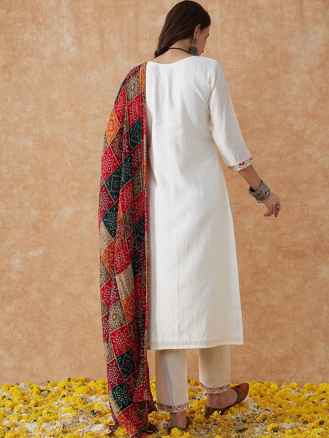 Sangria White Ethnic Motifs Embroidered Thread Work Straight Kurta & Trouser With Dupatta Product Details White, red & gold toned kurta ...