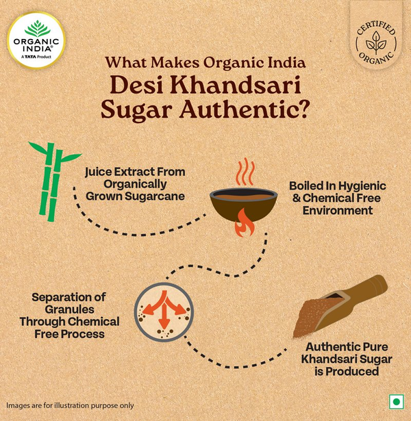 Organic India Desi Khandsari Sugar is an unrefined sugar made from certified organic sugarcane. The sugar is prepared using a traditional four-step method and comes in a package designed for convenient use. It can be used to sweeten beverages, desserts, baked goods, and other foods.