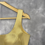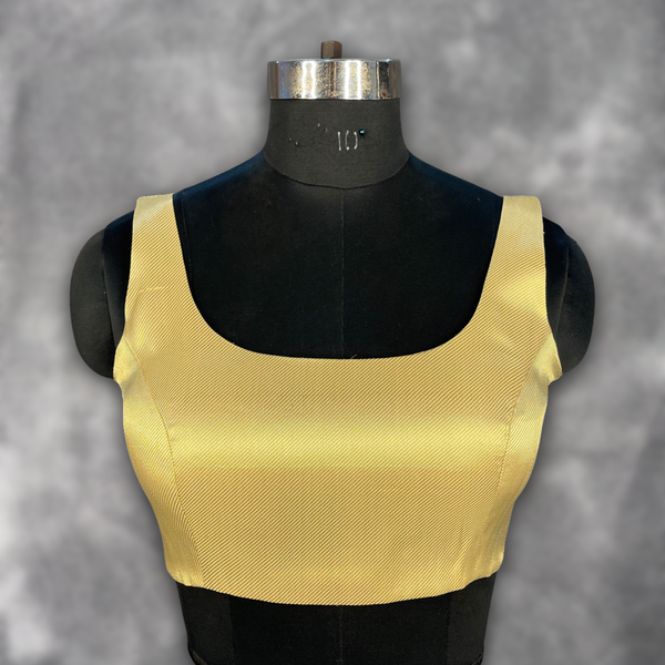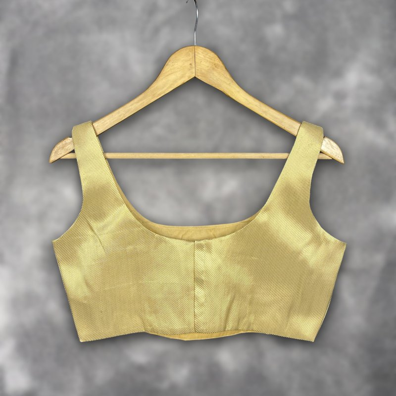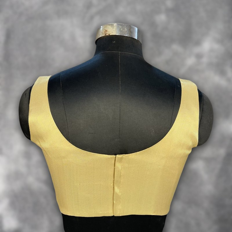 Indulge in glamour with this stunning golden brocade blouse. It features a deep, round neckline at the front and back, adding a touch of timeless sophistication to your outfit. This sleeveless blouse not only boasts style but also ensures comfort with its complete cotton lining and padding. Dressing up is effortless with the convenient back opening secured by a hook and eye closure. Embrace the radiant charm of gold with this versatile piece, suitable for various occasions, and guaranteed to make you shine effortlessly.