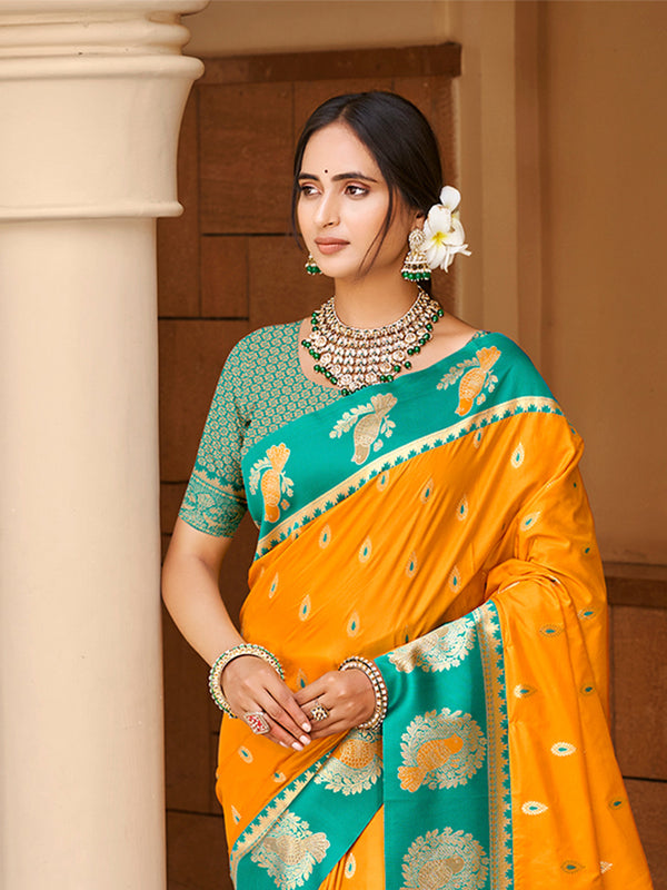 Sangam Prints Yellow Silk Woven Work Traditional Saree - Free Size