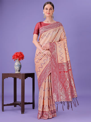 Astita Peach & Red Lichi Silk Saree with Rich Woven Border and Zigzag Pattern - Wedding & Festive Wear