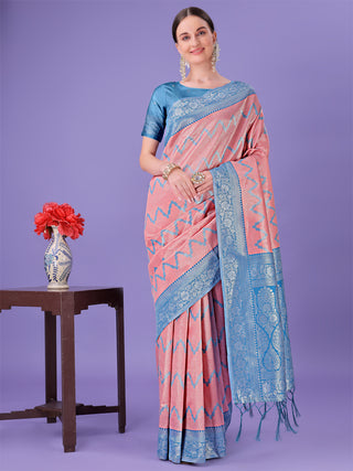 Astita Graceful Pink Lichi Silk Saree with Contrast Blue Woven Border & Floral Zari Design - Wedding & Festive Wear - Distacart