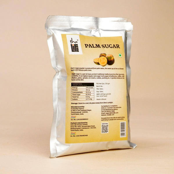 Palm Sugar powder is extracted from palm neera, the sweet sap of the cut flower buds of palmyra palm trees. Its glycemic index is low and it is a rare plant source of vitamin B12. It is rich in 23 other essential vitamins & minerals like Iron, Calcium, Phosphorus & Magnesium. It is safe for children as it is free from chemical bleaches & preservatives,