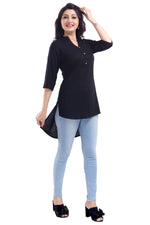 Everyone needs a staple black Kurti in their wardrobe. We have got this beautiful black button-down-styled rayon Kurti exclusively designed and sold by Snehal Creation. It is a short-length kurta with roll-up sleeves and thus can be styled in multiple ways like with your heavy ghagra or with your favorite pair of ripped jeans. It has got a beautiful V-neckline and this Kurti is stitched in an up-down style which makes it stand out from the crowd. The plain rayon material is without any prints and is very breathable thus will keep you fresh throughout the day.