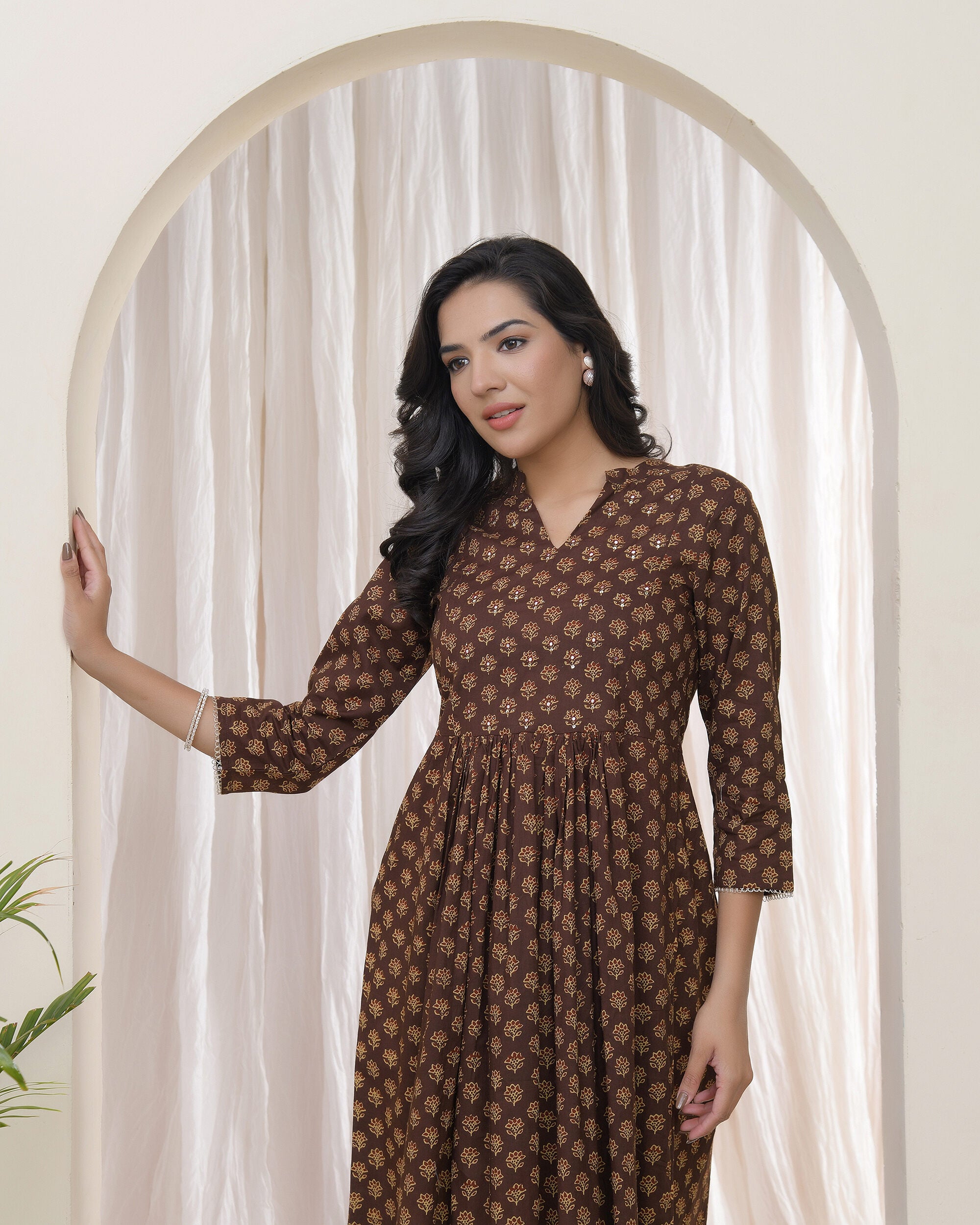 Vaasva Brown Boonta Cotton Printed Gathered KurtiProduct Details:Brown boonta Printed gathered style kurti with embroidered yoke & collarLegal ...