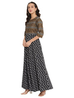• The Black and golden chevron print a-line kurta, has a boat neck, three-quarter sleeves, and flared hem