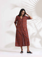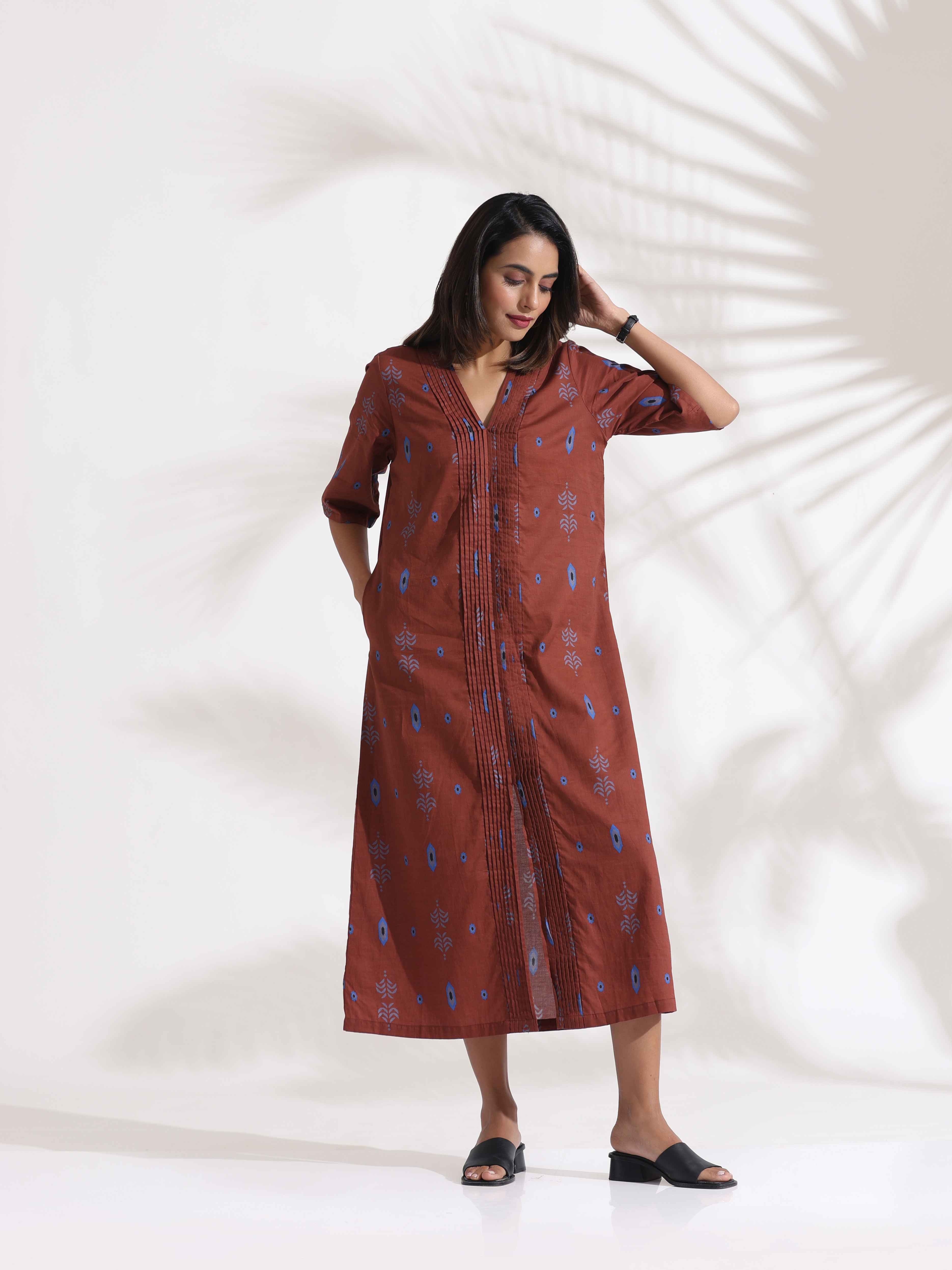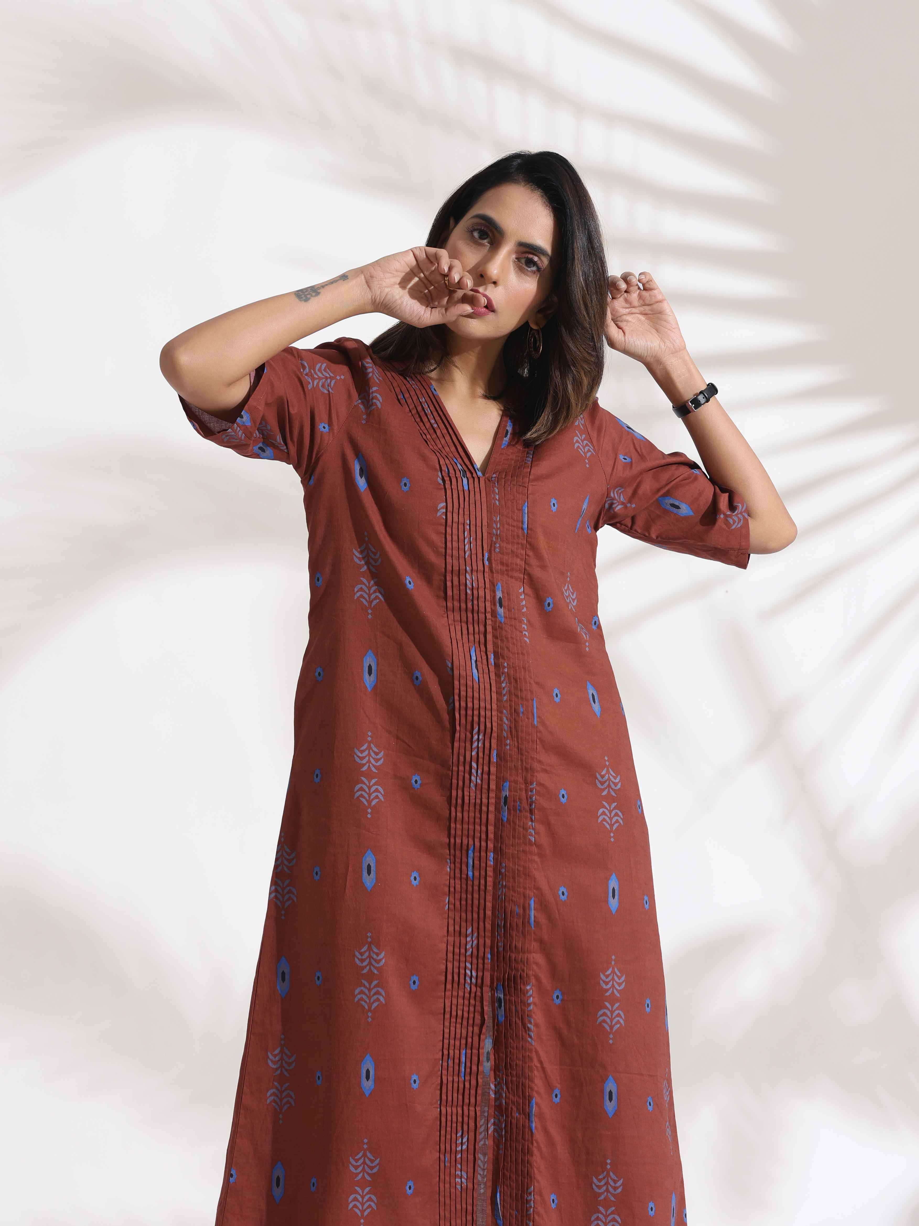 trueBrowns Brown Cotton Print pleated DressDescription Elevate your style with this brown cotton printed oversized dress. The fit makes it the perf...