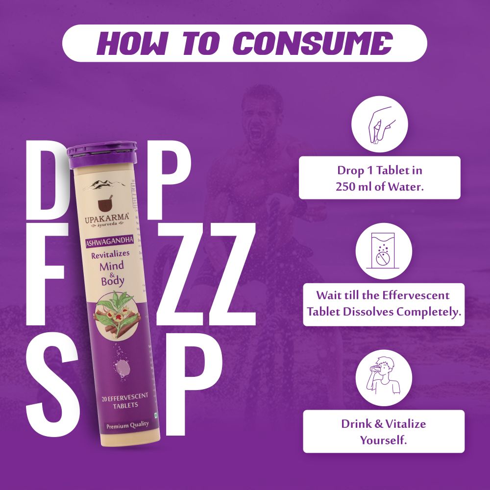 Upakarma Ayurveda Ashwagandha Effervescent Tablets About the product: Premium Quality Ashwagandha Effervescent Tablets are easy to carry and use. J...