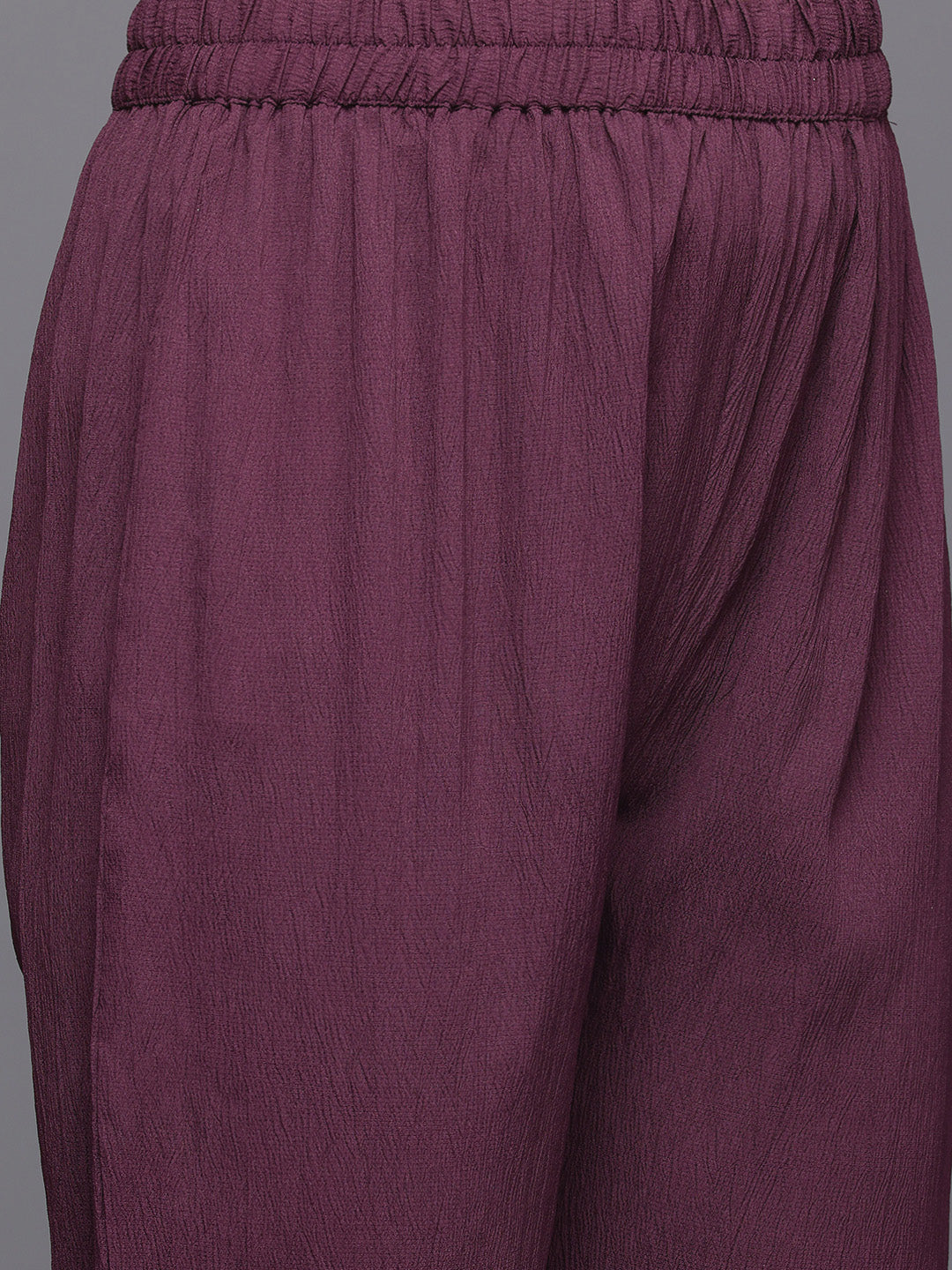 Purple V Neck With Zari Lace Embellished Yoke, Gather Detailed At Empire Line A-Line Kurta, Three Quarter Sleeves Paired With Tonal Bottom