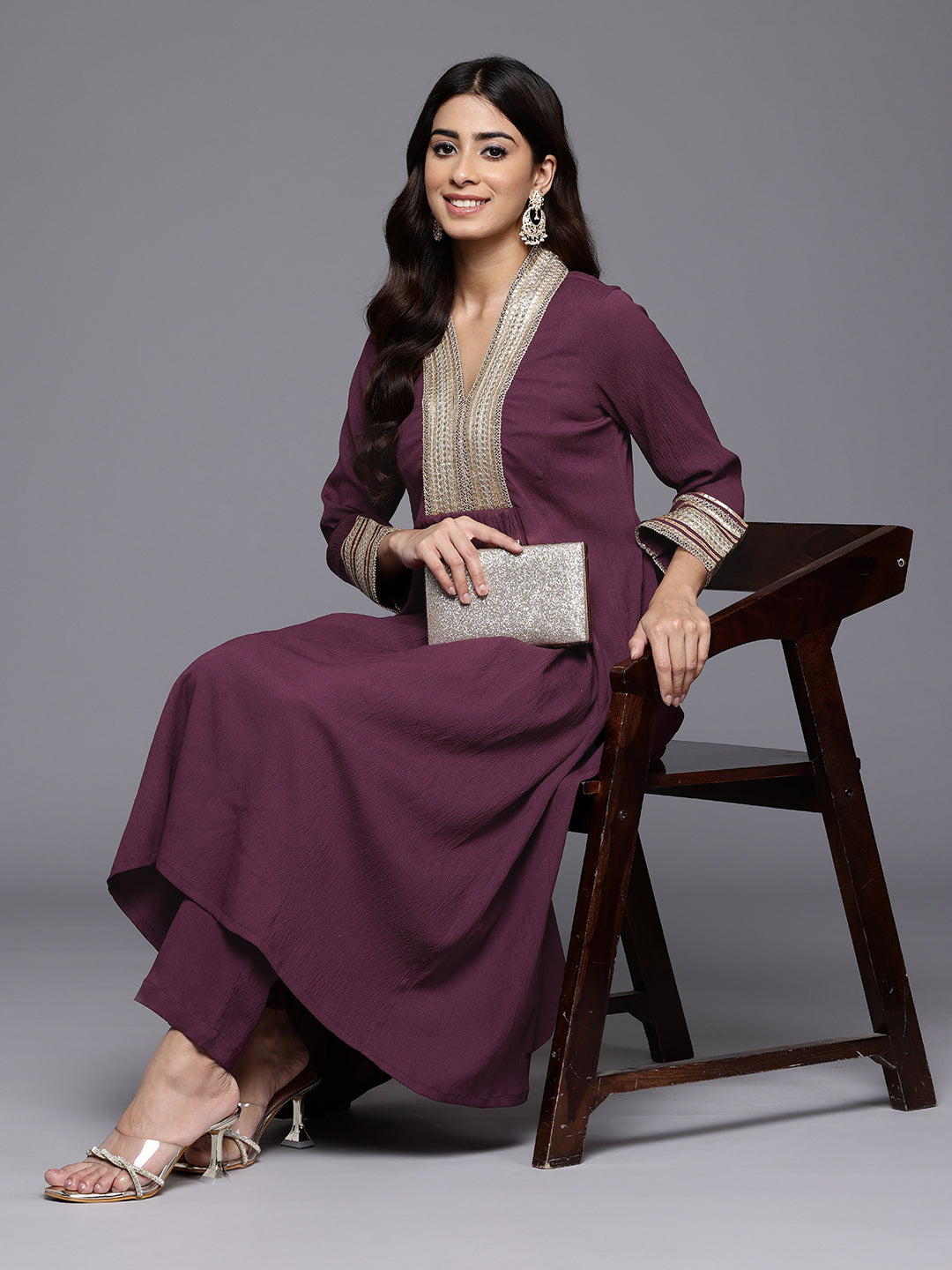 Varanga Women Purple Zari Lace Embellished Yoke A-Line Kurta SetPurple V Neck With Zari Lace Embellished Yoke, Gather Detailed At Empire Line A-Lin...