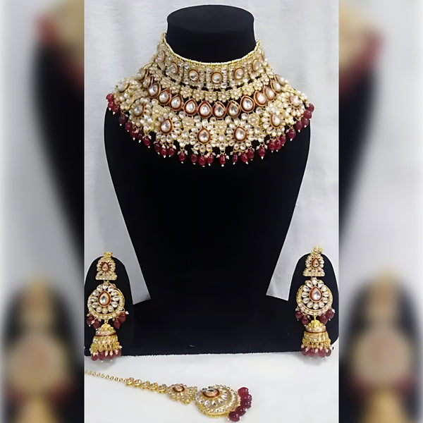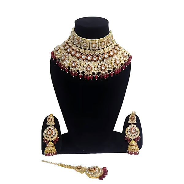 Jewel City Royal Kundan Bridal Choker Necklace Set with Maang Tikka and Earrings Color: Maroon Material: Alloy Make a grand statement on your spe...