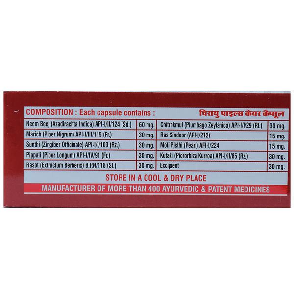 Chirayu Piles Care Capsule About the product: Offers a safe and natural ayurvedic formula for effective pile reduction without surgery. These capsu...