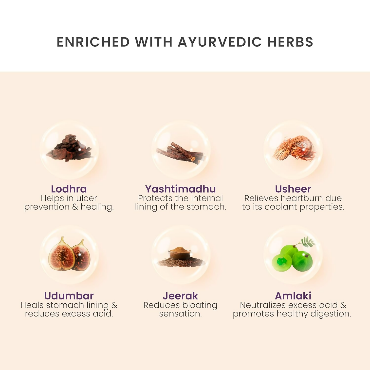 • FORMULATED WITH POWERFUL AYURVEDIC HERBS: Formulated with clinically tested & validated Ayurvedic herbs, these acidity relief tablets work naturally to ease discomfort without causing drowsiness, rebound acidity, or dependency. Yashtimadhu (Licorice) soothes and protects the stomach lining from acid damage, Jeerak (Cumin) eases bloating and aids smooth digestion, Lodhra promotes healing and neutralizes excess acid, and Usheer & Udumbar provide cooling relief for heartburn and gastric irritation. Together, they act synergistically to provide relief from acidity, restore natural digestive balance and support long-term gut health.
