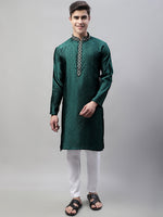 Jompers Men's Olive Green Jacquard Silk Collar Embroidered Kurta - S