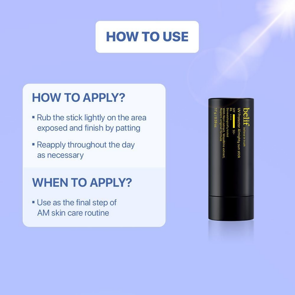 Belif UV Protector Almighty Sun Stick How to use: Use as the last step of your skincare routine, whenever sun block is needed, use frequently throu...