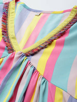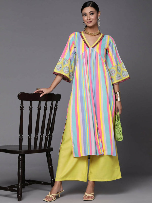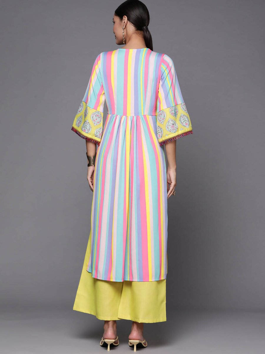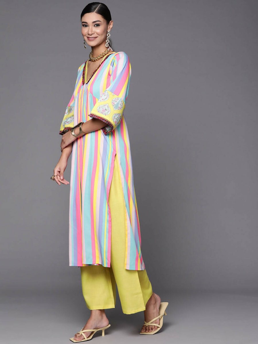 Ahalyaa Women Neon Green & Blue Candy Striped Kurta with Palazzos - S