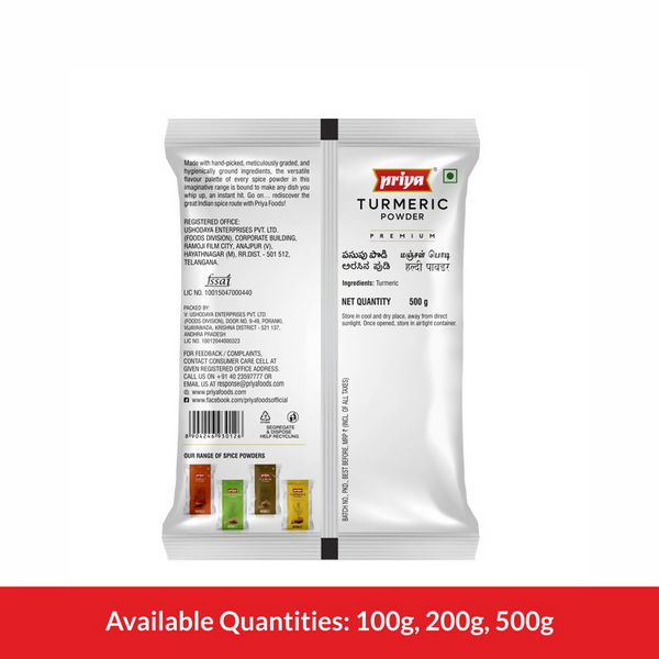 Priya Turmeric (Haldi) PowderAbout the Product:Indulge in the soothing aromas of Priya’s Turmeric Powder. Made from the finest quality turmeric, th...