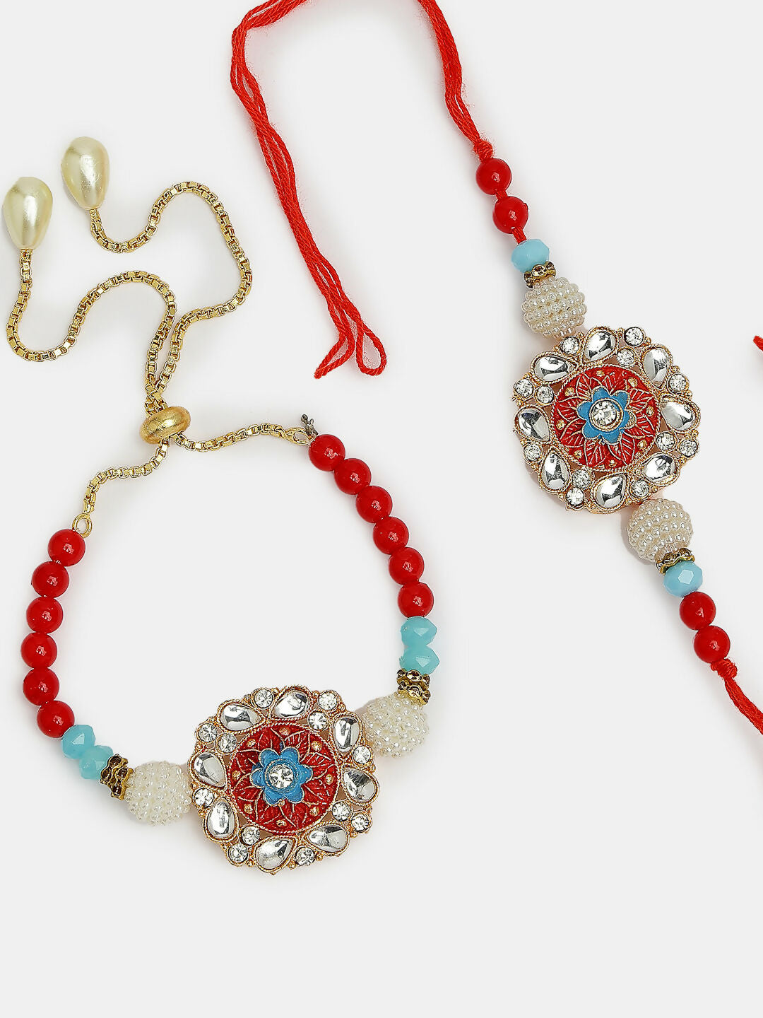 NVR Women & Men Set of 2 Red-colored Stone-Studded & Beaded Bhaiya Bhabhi Rakhi With Roli Chawal & Chocolate Style Note: Celebrate the ...