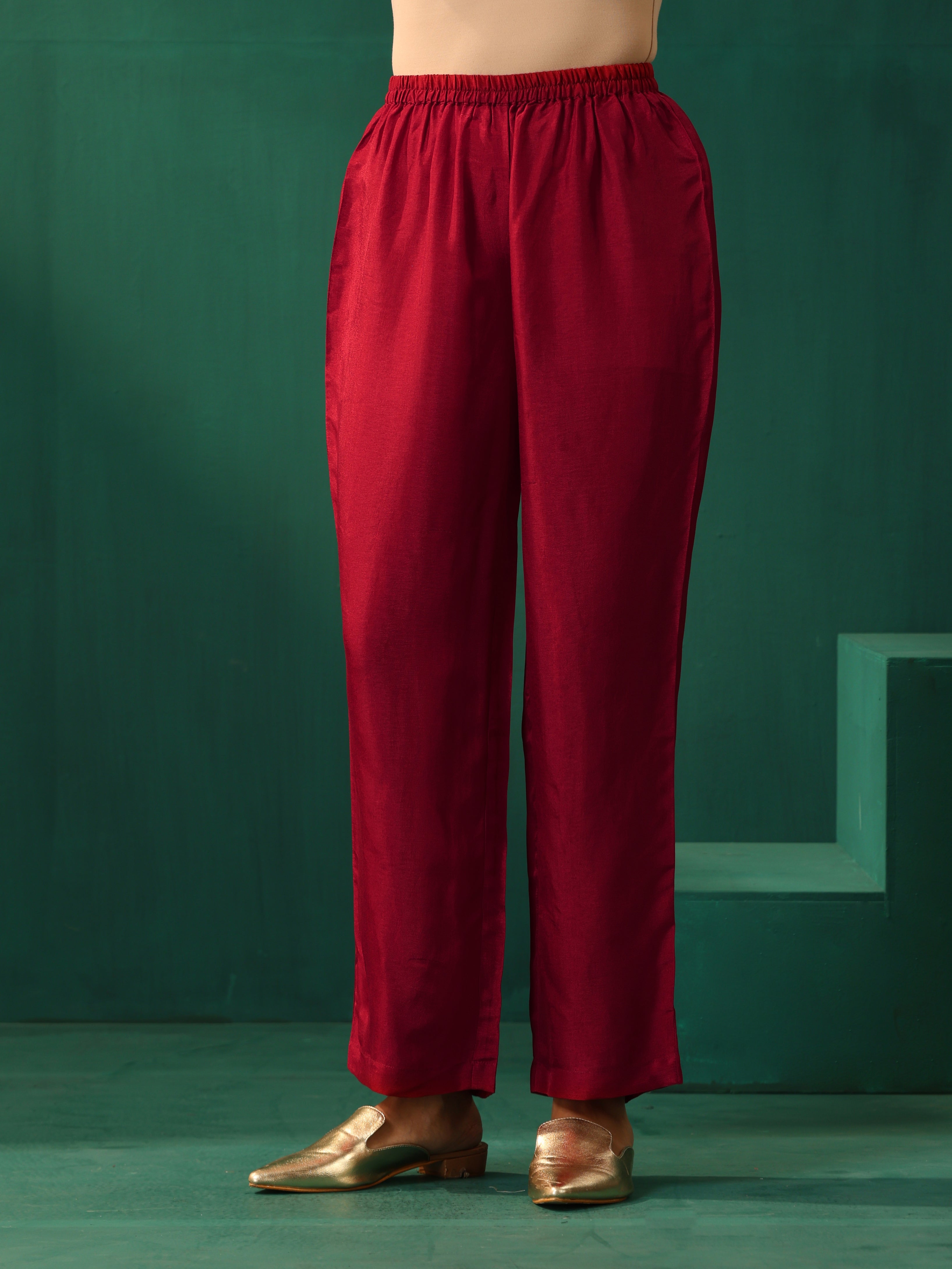 • Viscose Silk Flared Anarkali Kurta with gathers and side zip. Paired with elasticated waist pant. Style with pair of mules to complete the look.