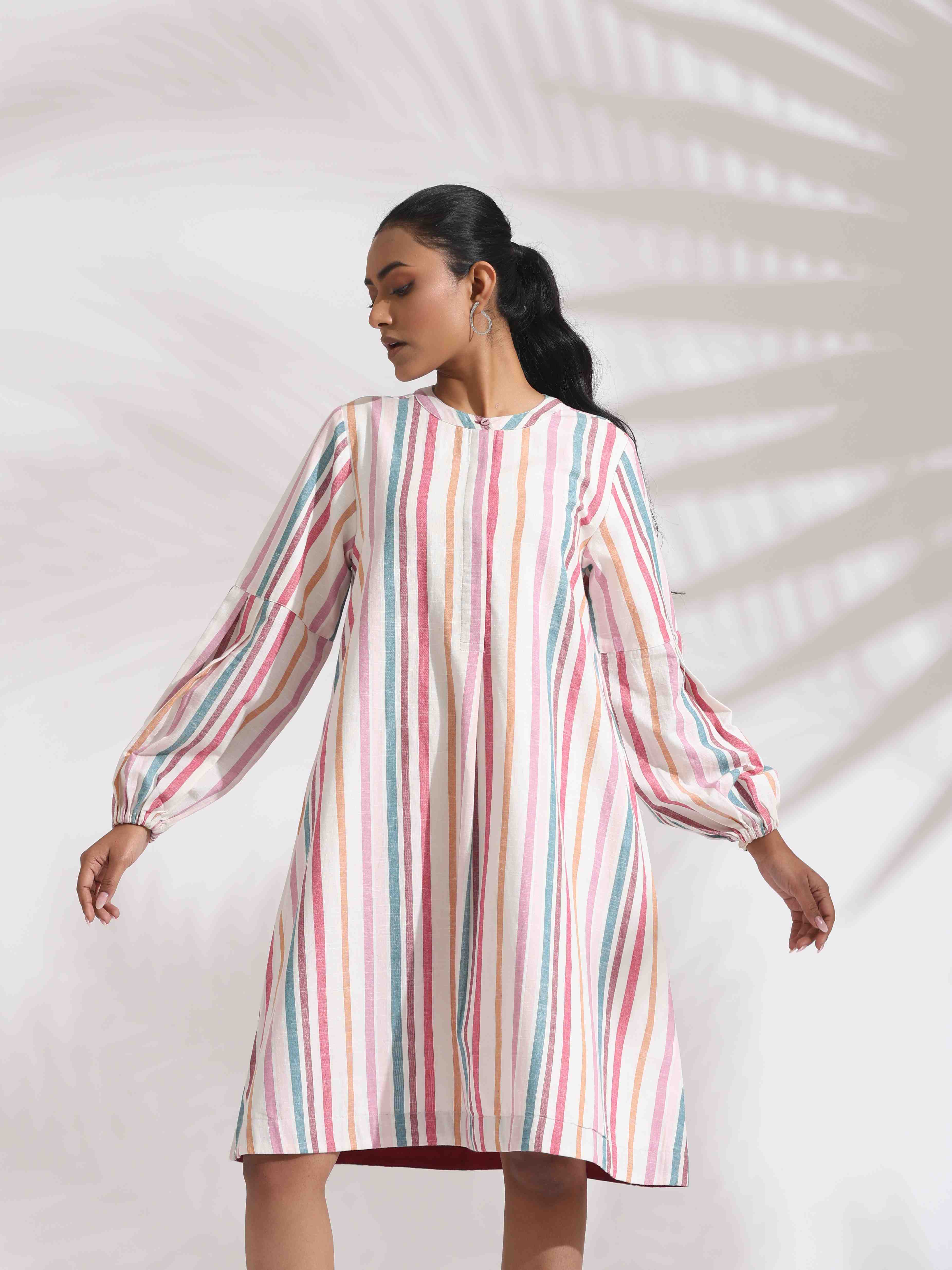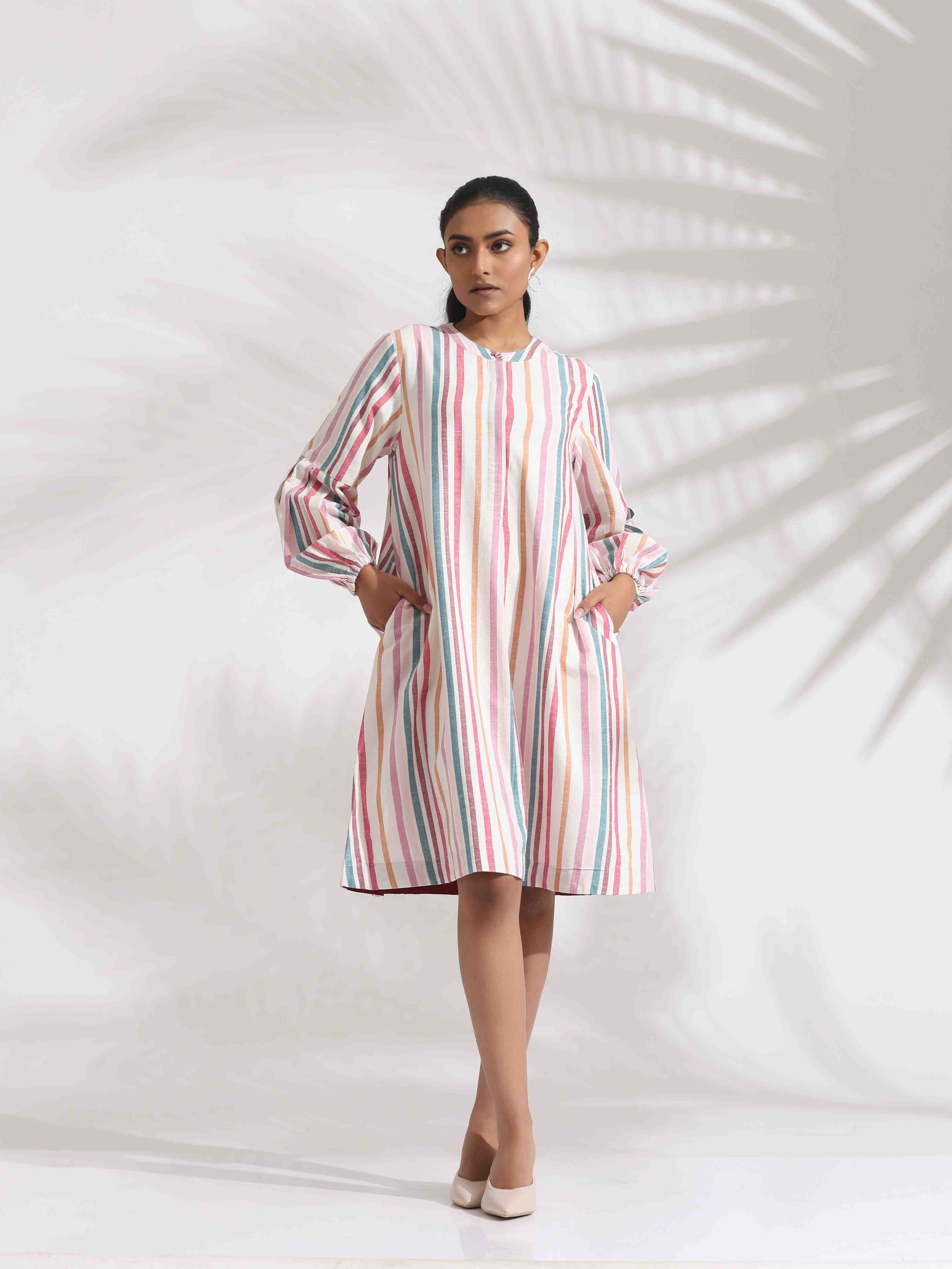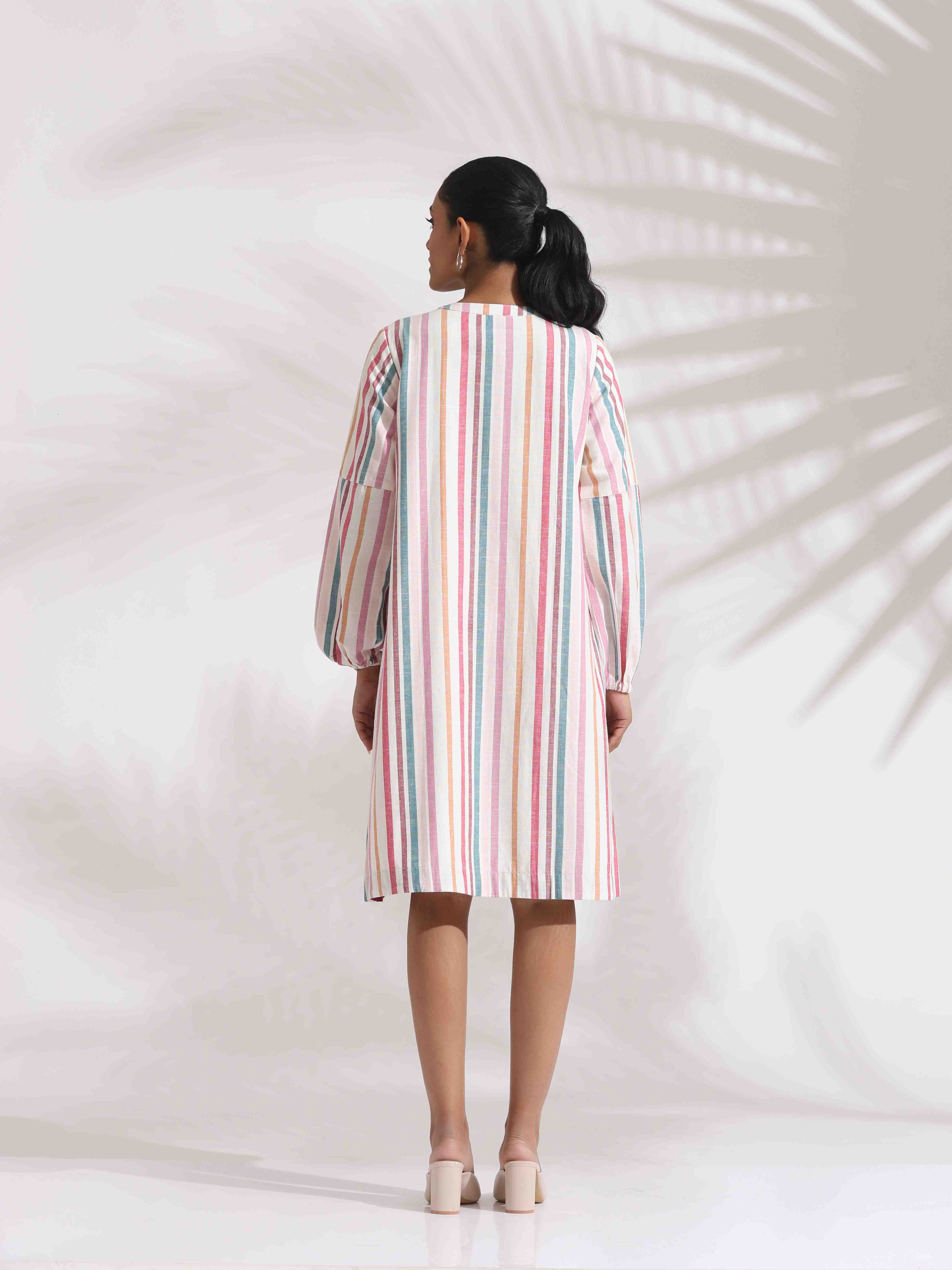 • Elevate your style with this multi stripe cotton short dress. A pleat has been added in front for ease, it's an ideal blend of elegance and comfort.
