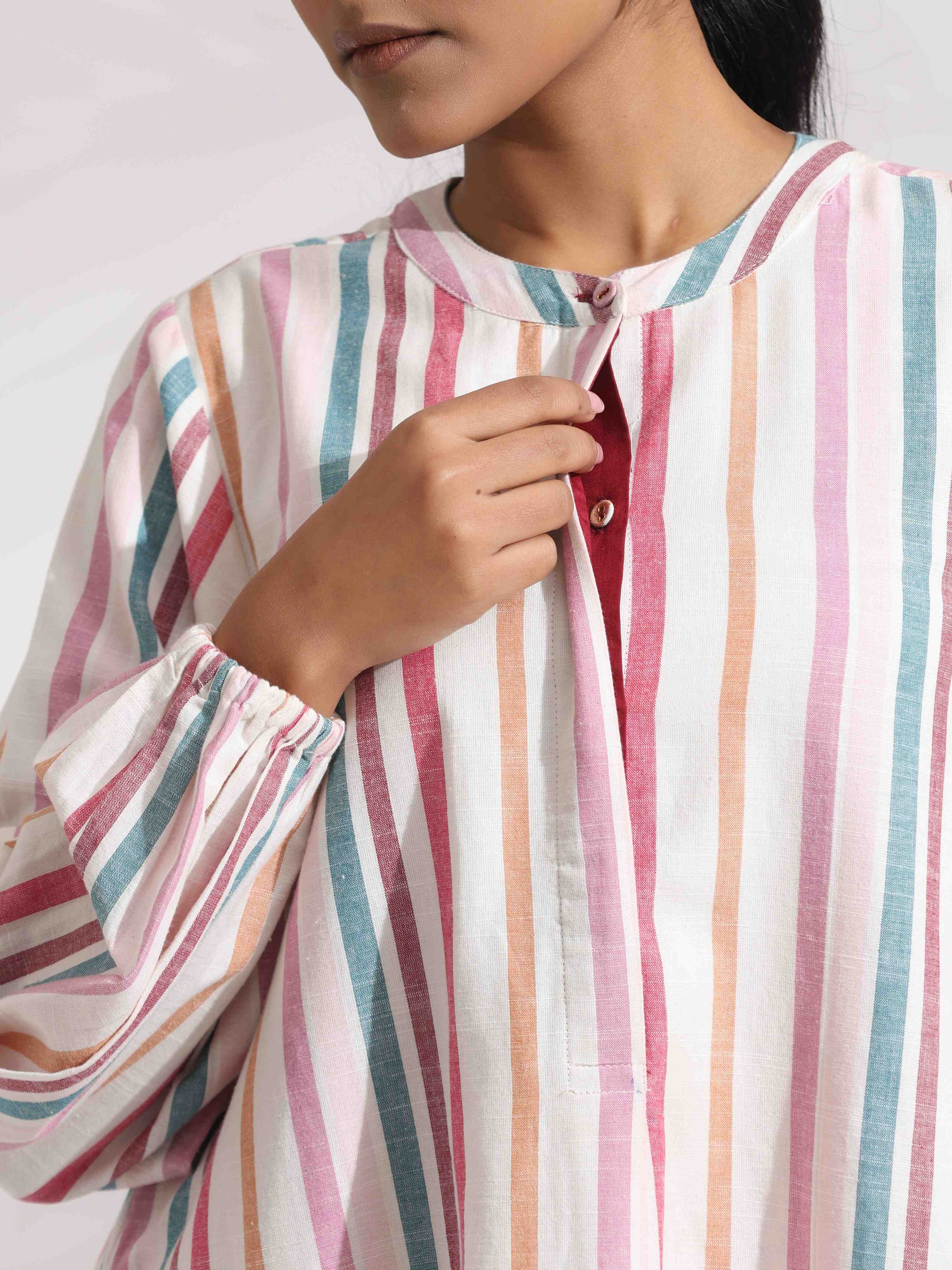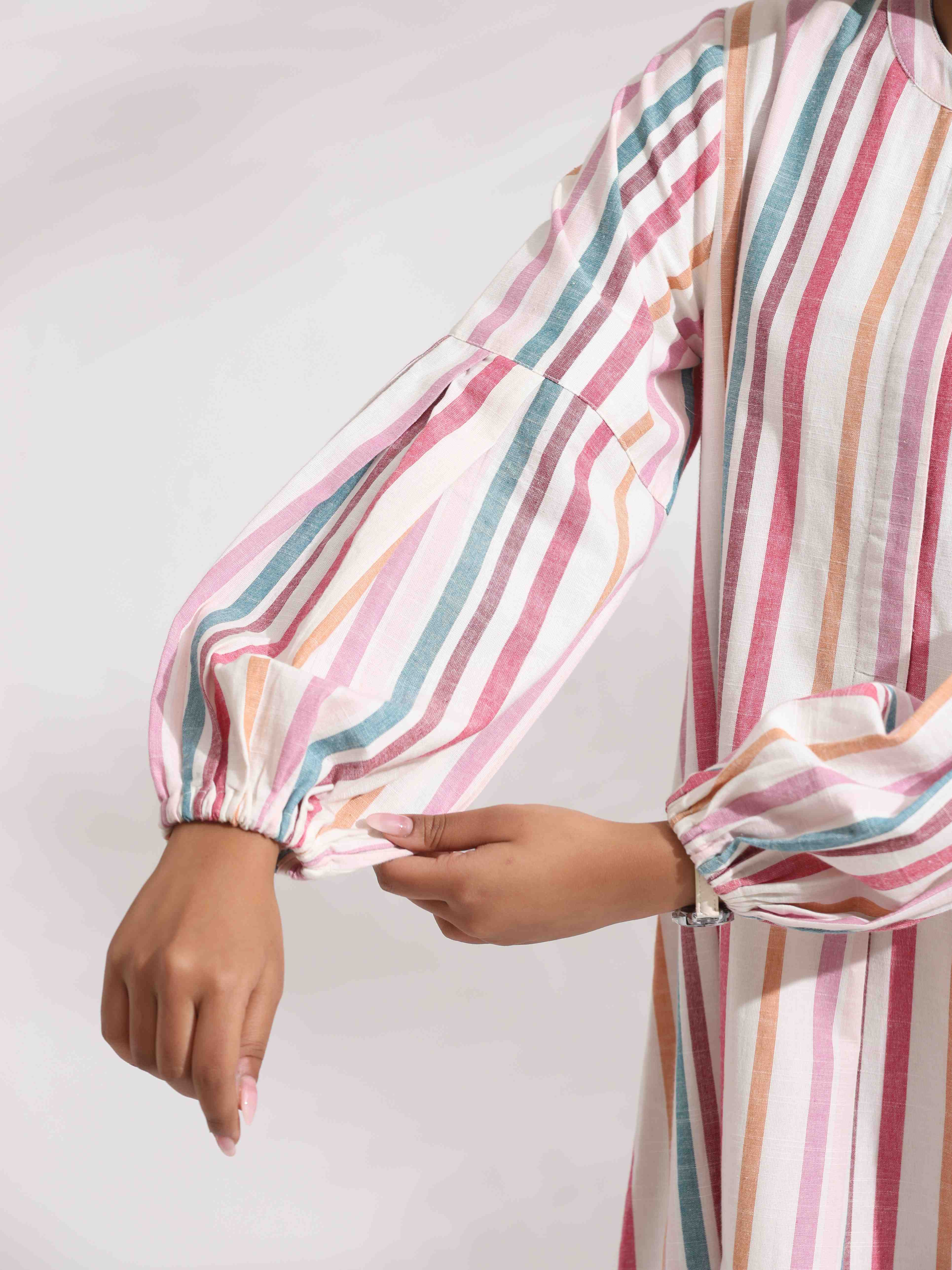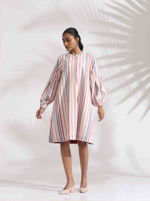 • Elevate your style with this multi stripe cotton short dress. A pleat has been added in front for ease, it's an ideal blend of elegance and comfort.