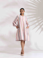trueBrowns Off-White Cotton Multi Stripe Short DressDescription Elevate your style with this multi stripe cotton short dress. A pleat has been adde...