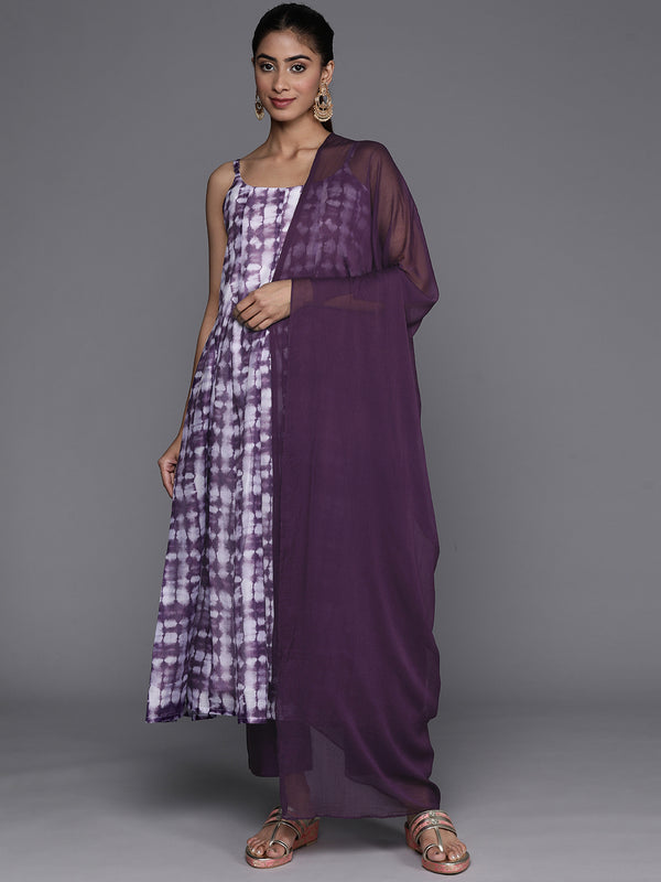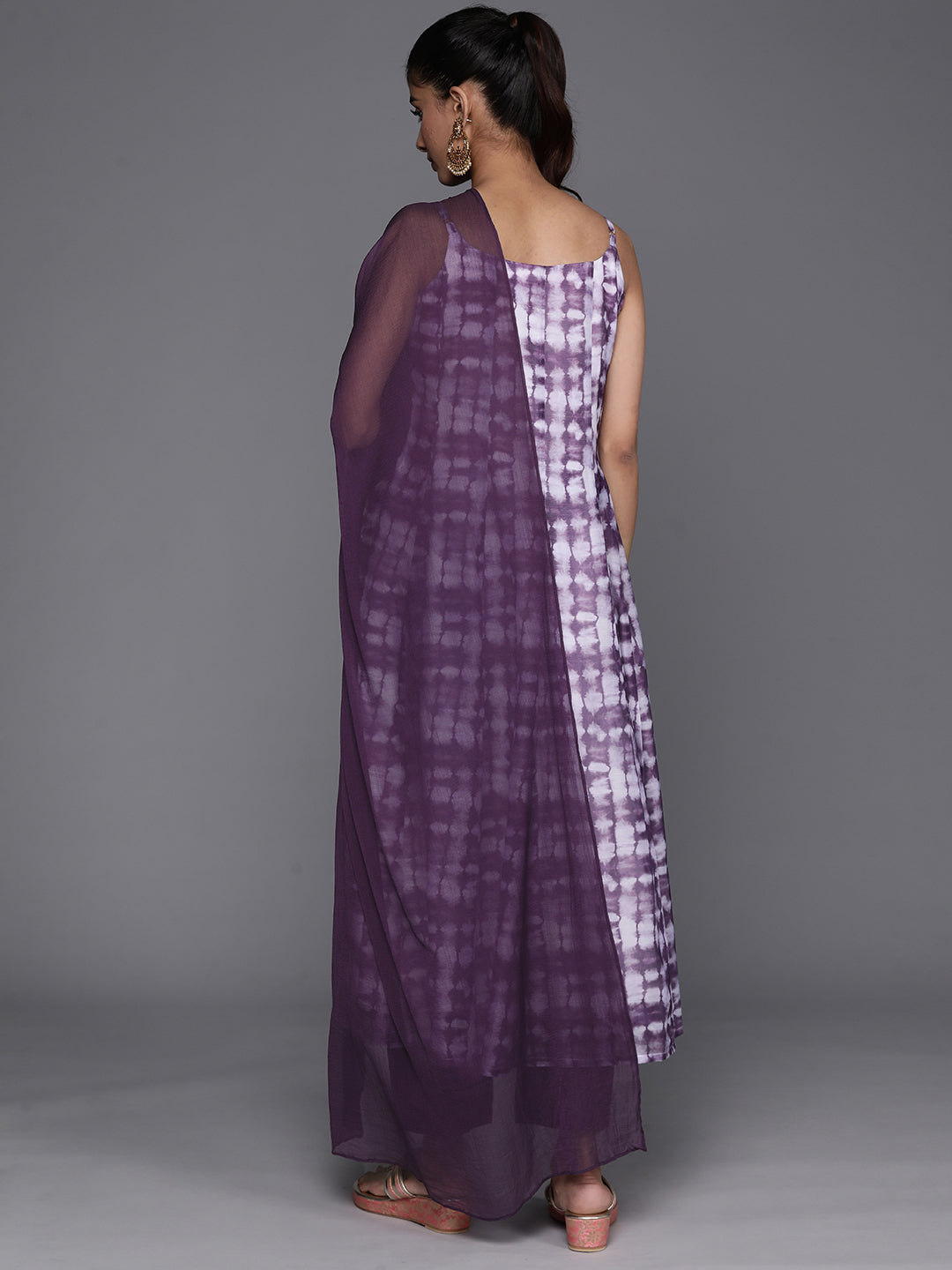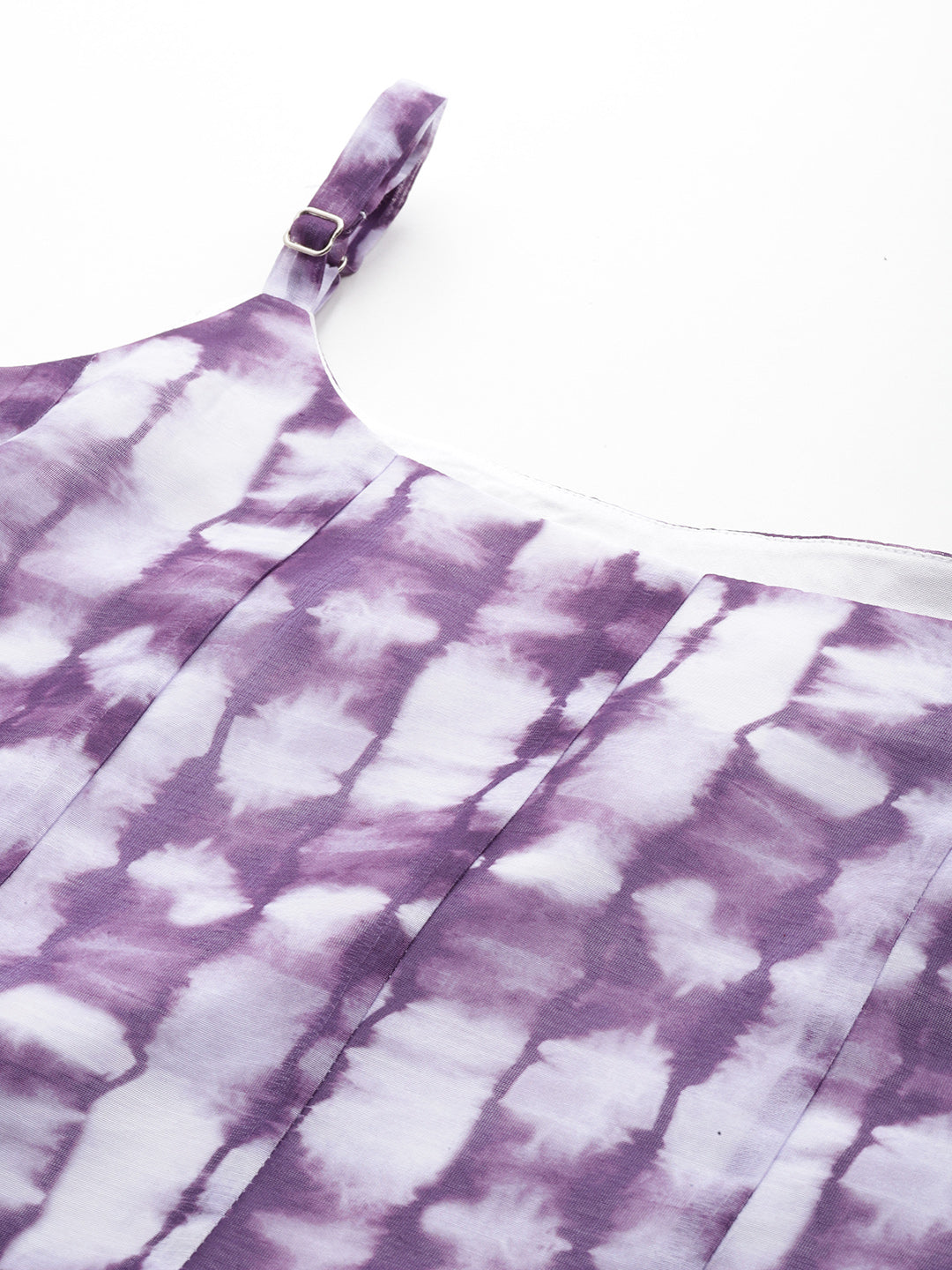 Violet Shibori Printed Spaghetti Strap Anarkali Style Kurta Paired With Tonal Solid Bottom And Tonal Solid Dupatta