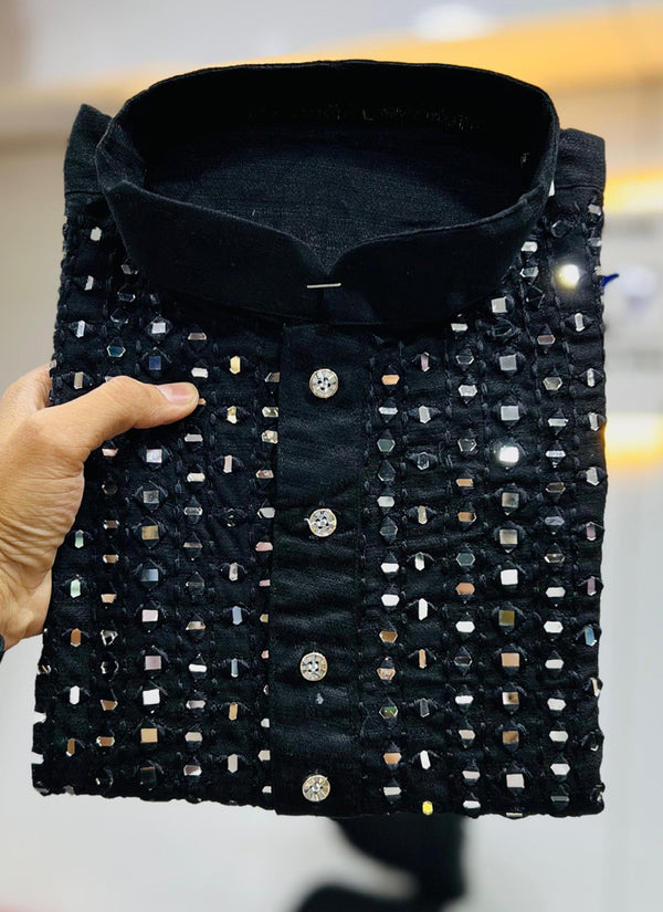 Prazu Fashion Black Soft Silk Real Mirror Work KurtaAbout the Product: GENDER : male Colour : Black Work/Pattern : Mirror Work Fabric : Silk Neck L...